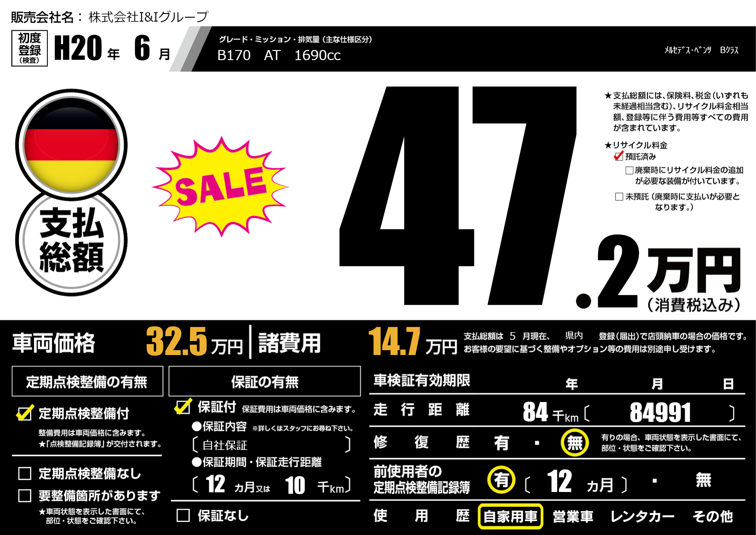 | 車名 | メルセデス・ベンツ Bクラス | グレード ミッション 排気量 |