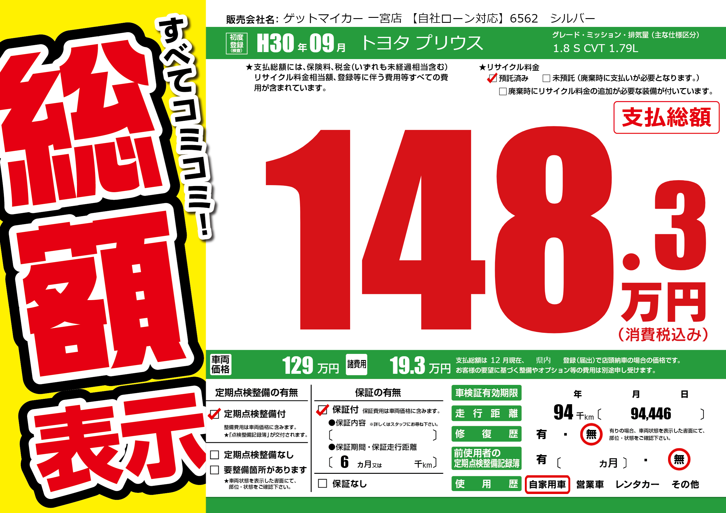 | 車名 | トヨタ プリウス | グレード ミッション 排気量 |