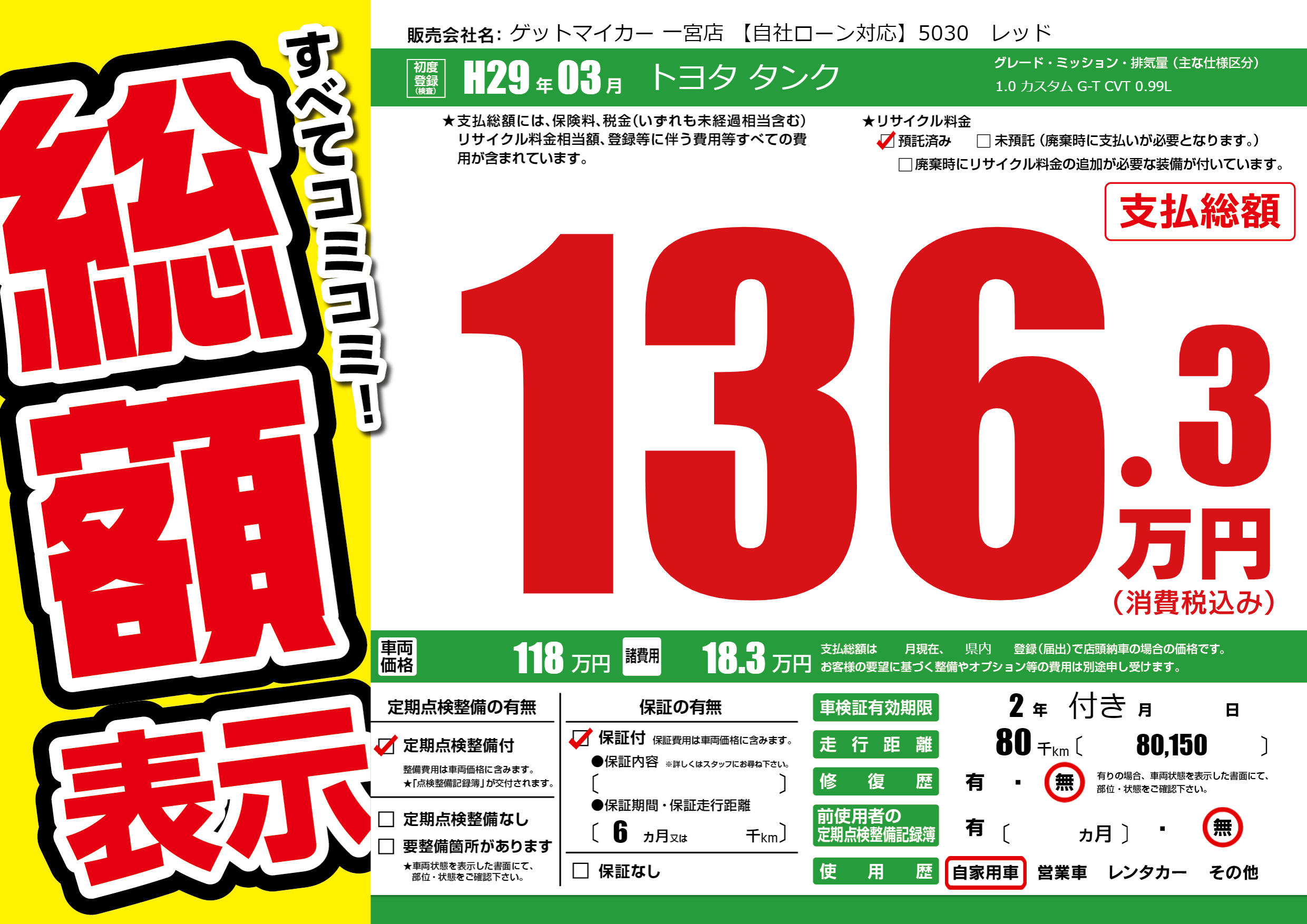 | 走行キロ | 8万km | 初年度登録 | H29年03月 |