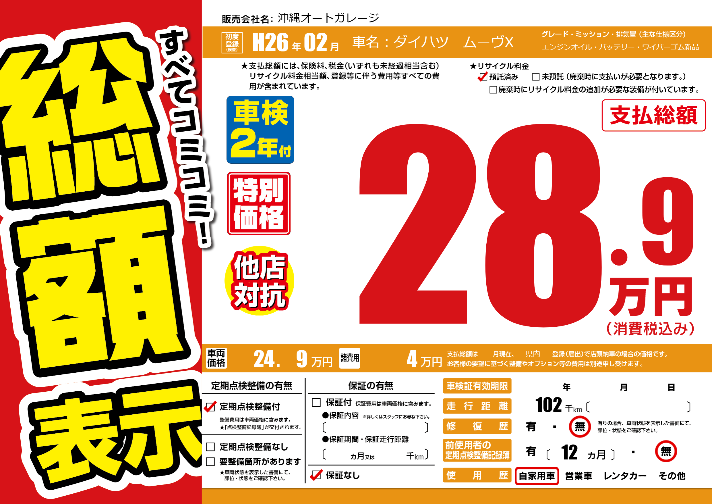 | 車名 | 車名:ダイハツ ムーヴX | グレード ミッション 排気量 |