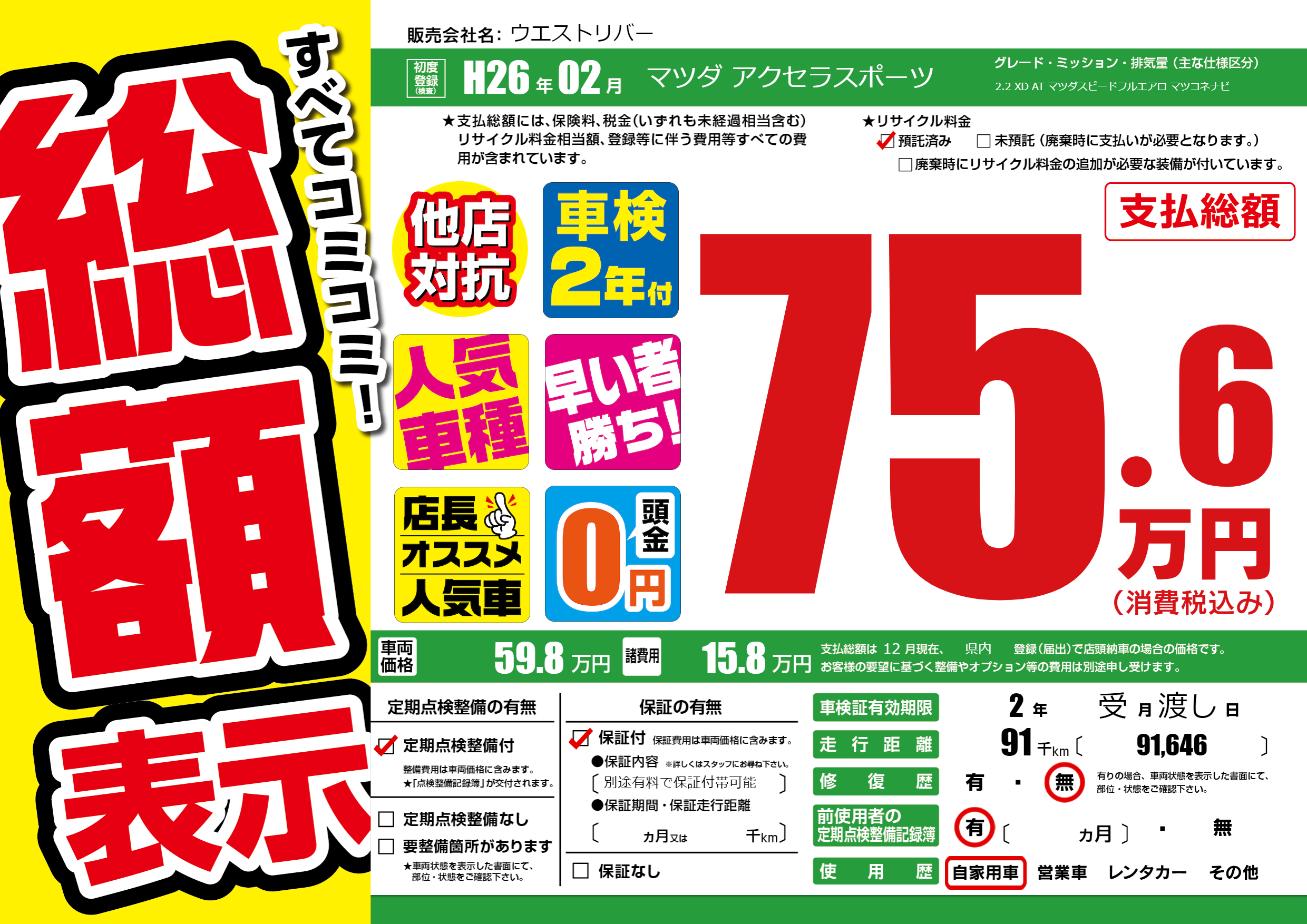 | 走行キロ | 9.1万km | 初年度登録 | H26年02月 |