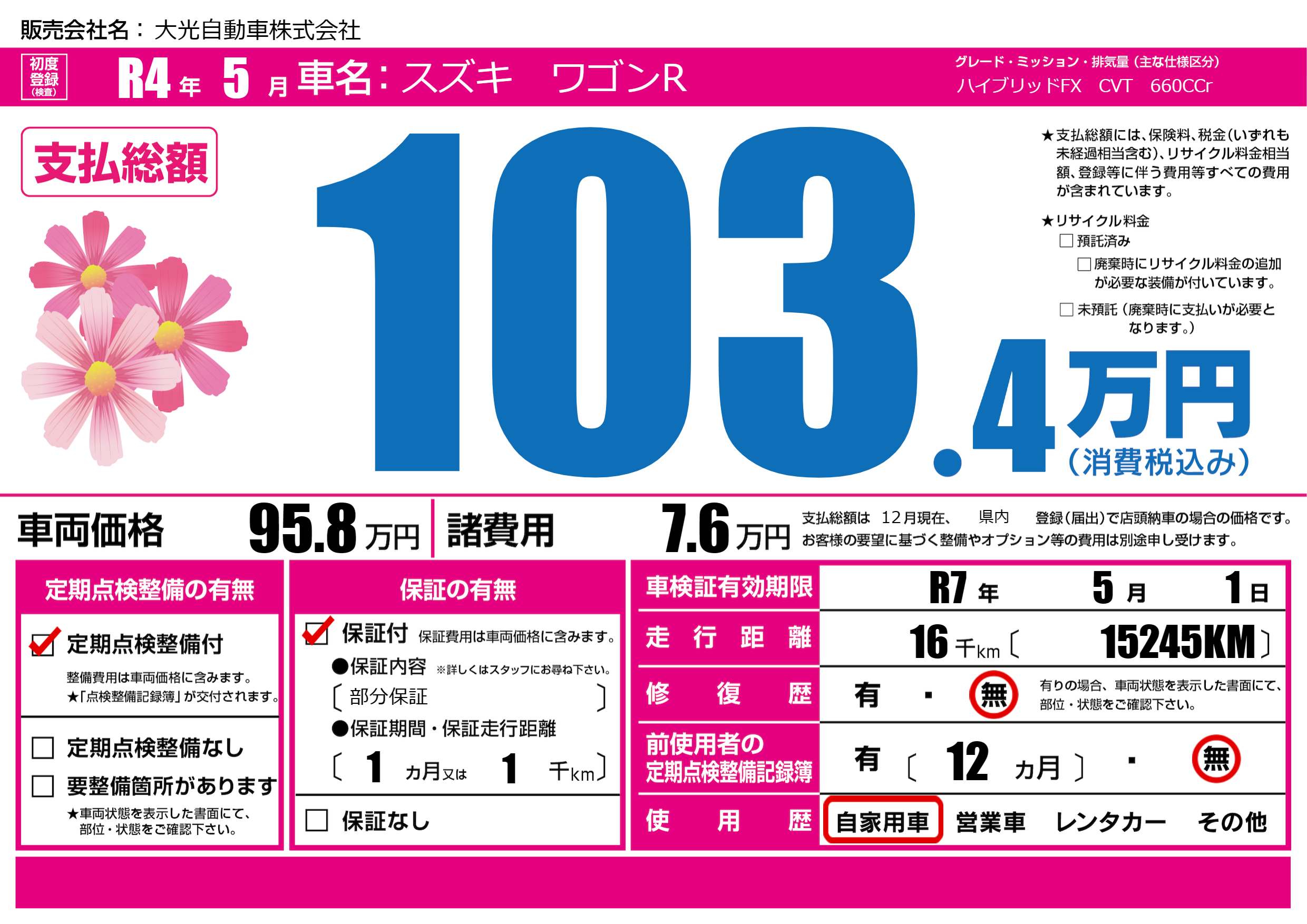 | 車名 | スズキ ワゴンR | グレード ミッション 排気量 |