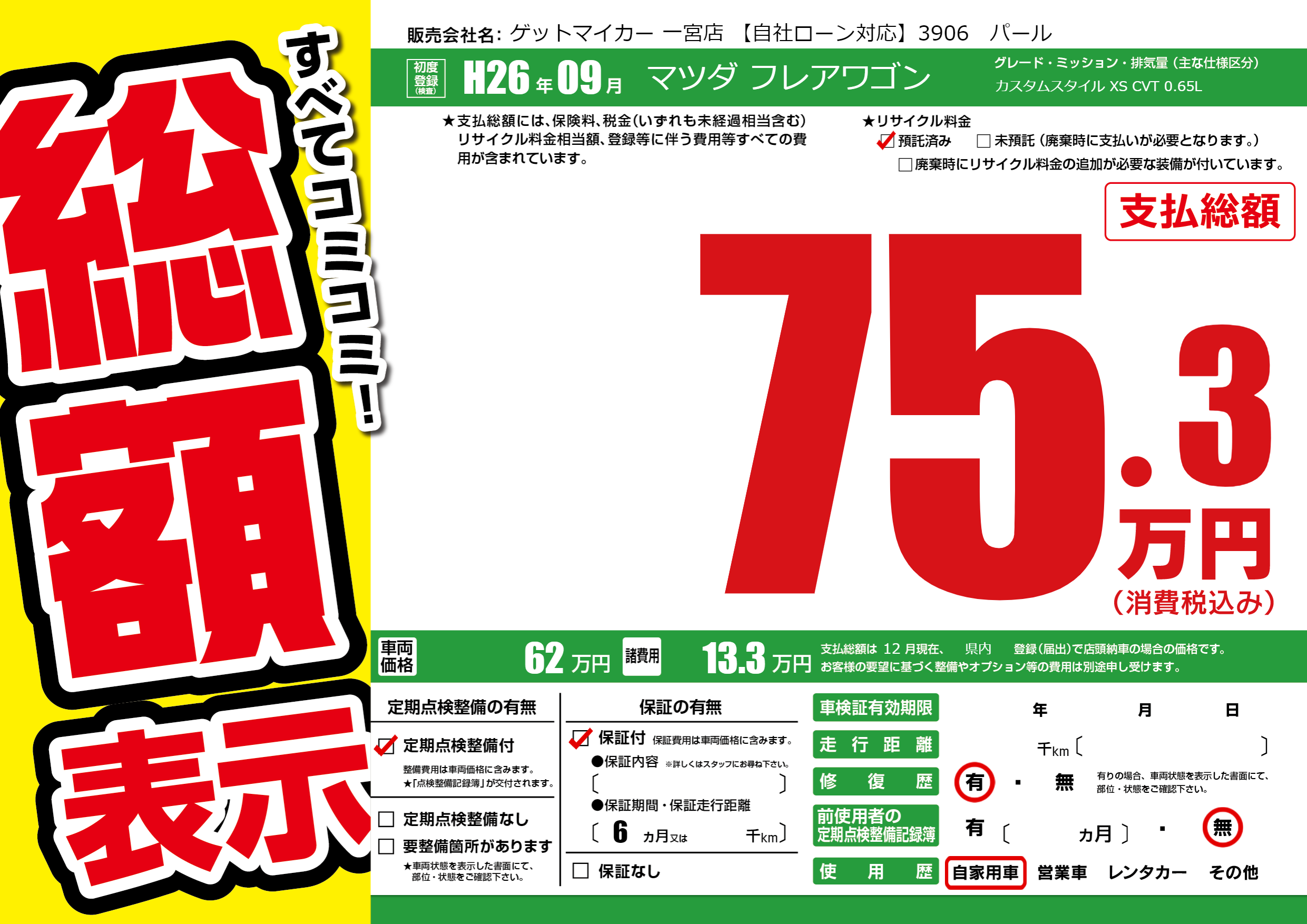 | 車名 | マツダ フレアワゴン | グレード ミッション 排気量 |