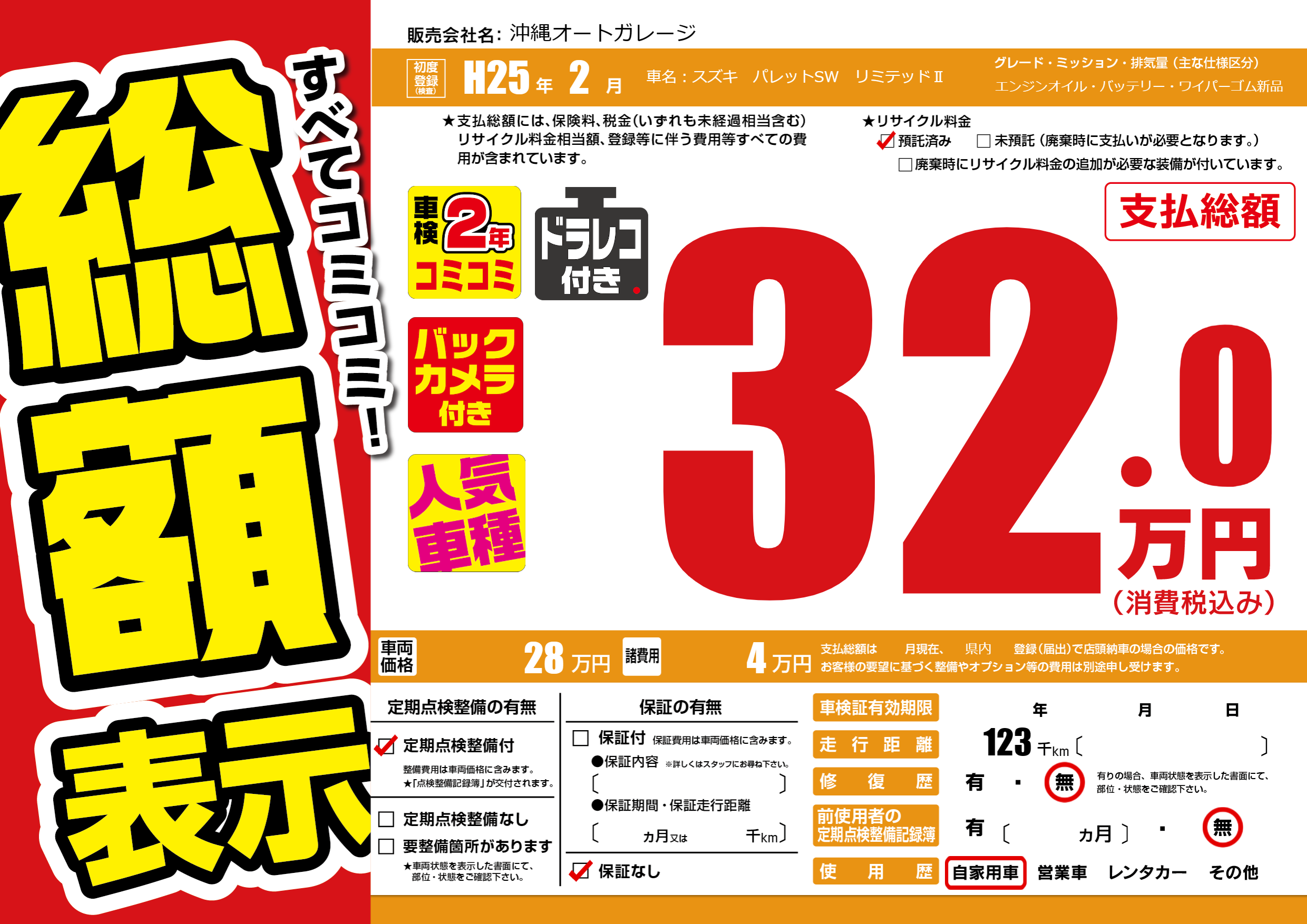 | 走行キロ | 12.3万km | 初年度登録 | H25年2月 |