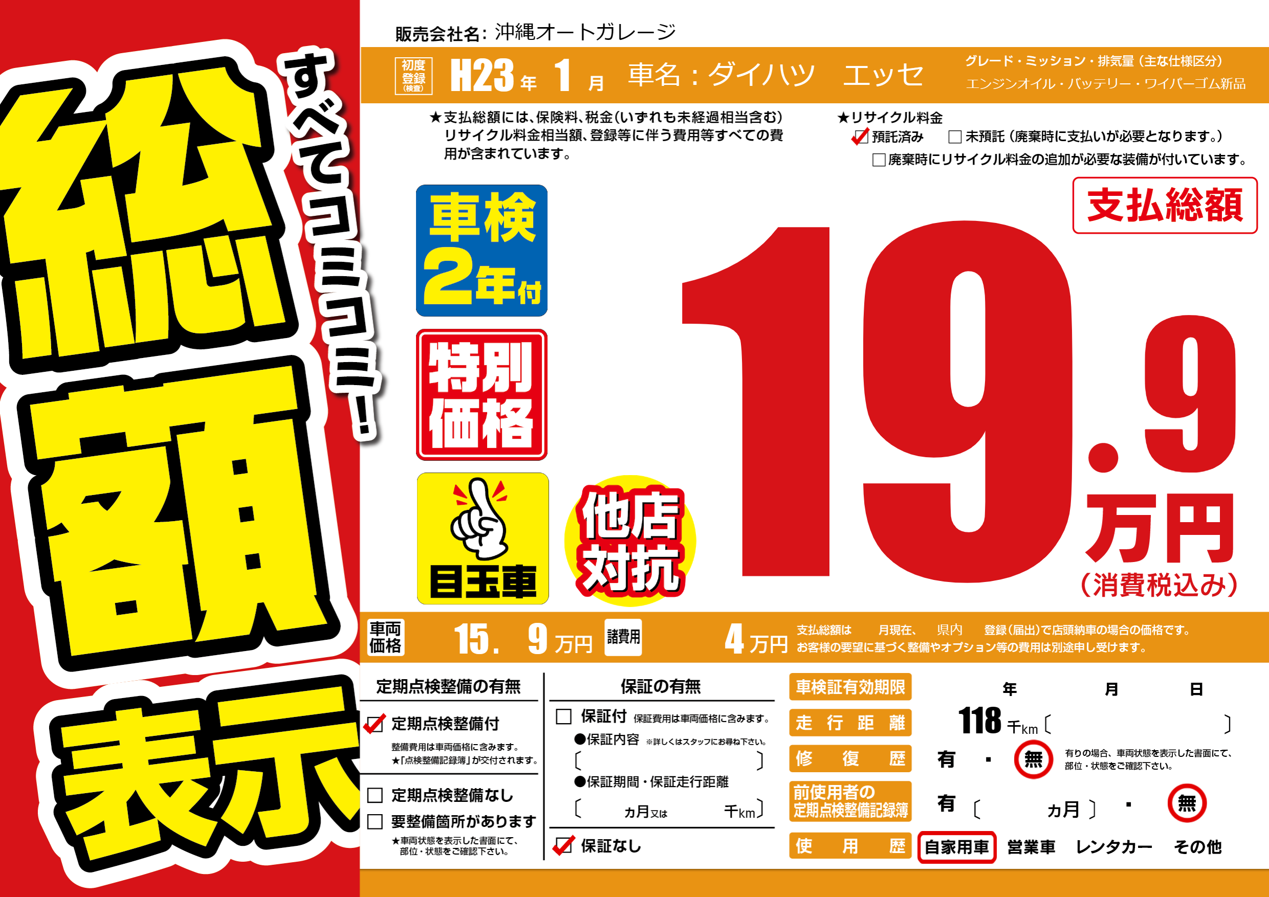 | 車名 | 車名:ダイハツ エッセ | グレード ミッション 排気量 |