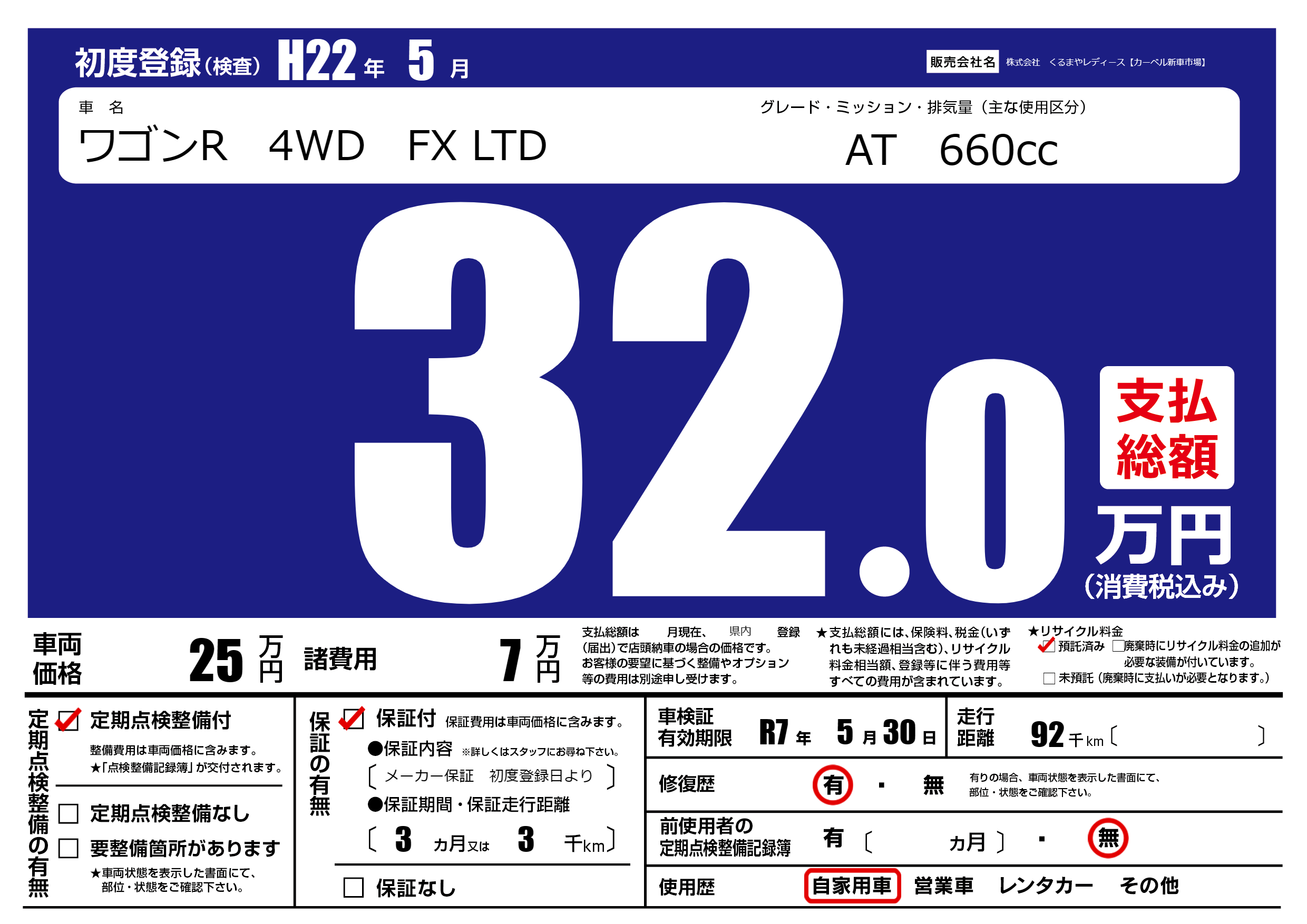 | 走行キロ | 9.2万km | 初年度登録 | H22年5月 |