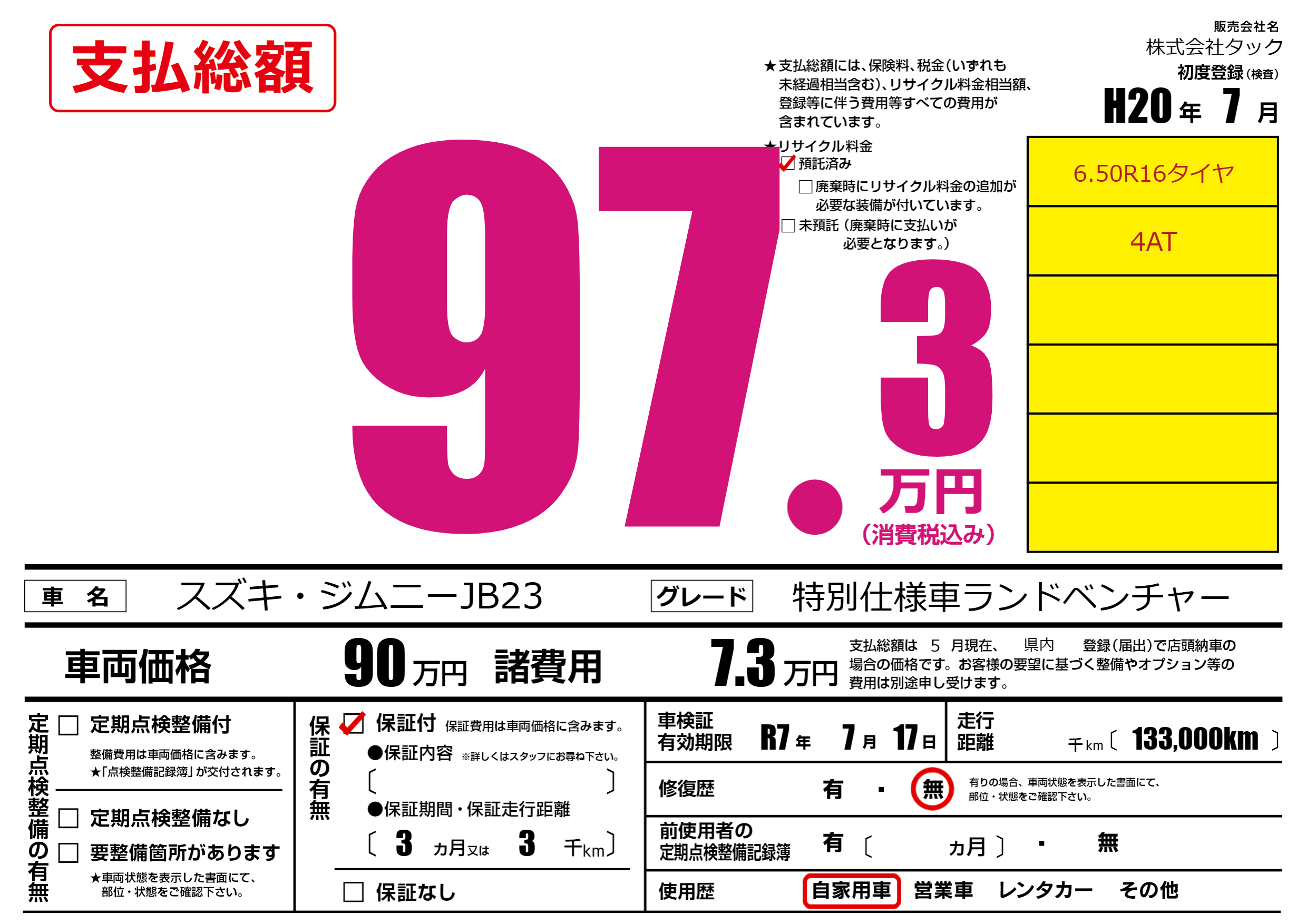 | 車名 | スズキ・ジムニーJB23 | グレード ミッション 排気量 |