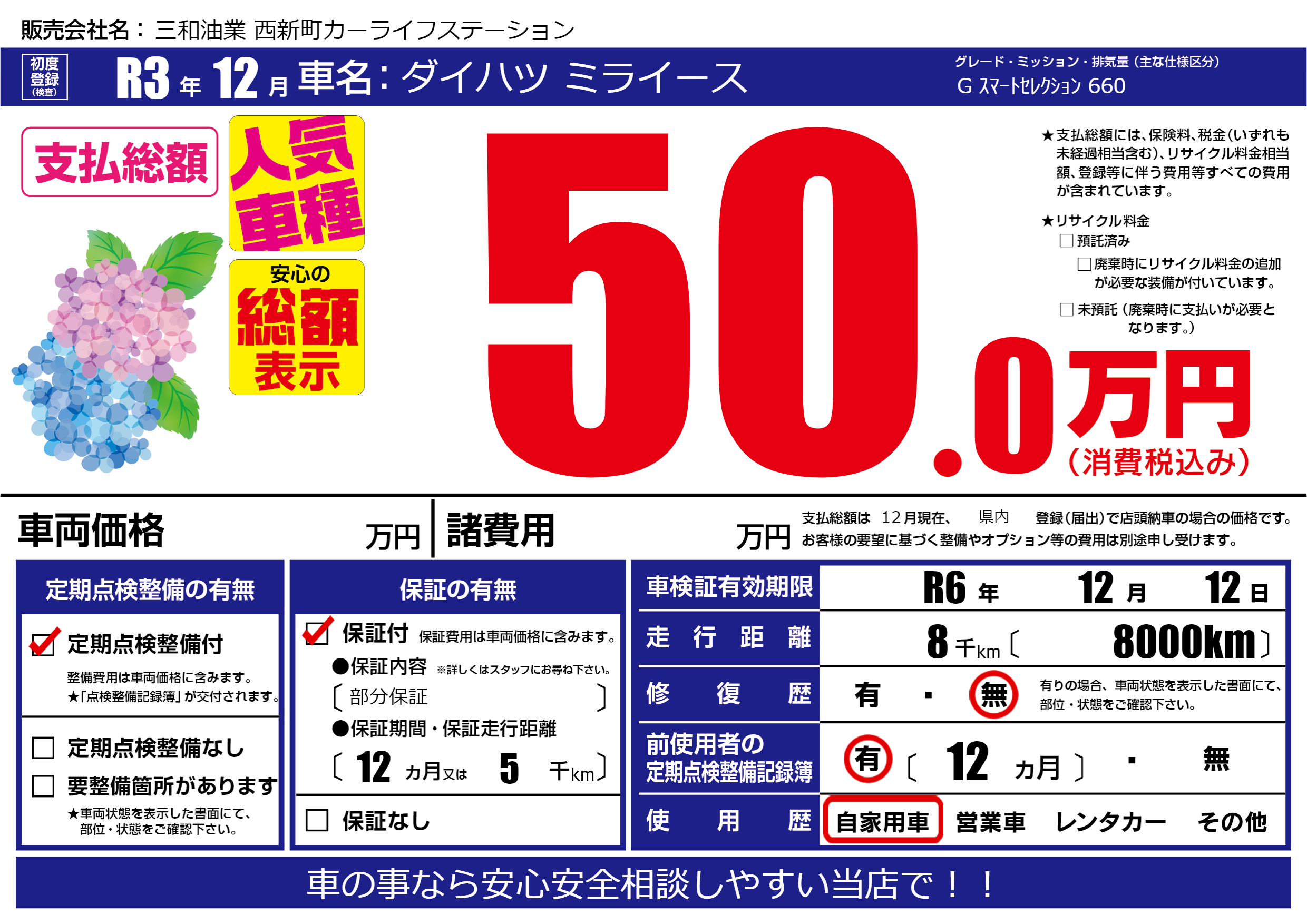 | 走行キロ | 0.8万km | 初年度登録 | R3年12月 |
