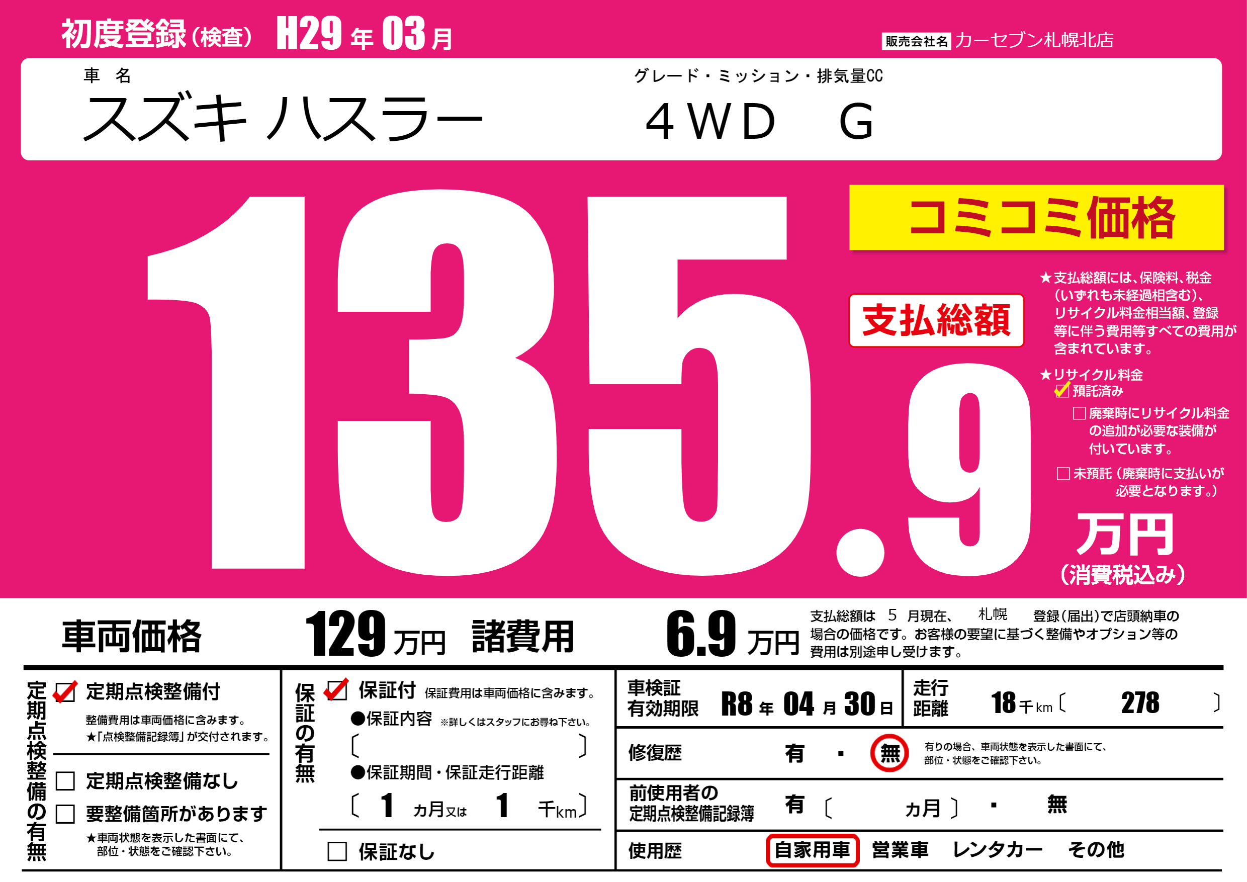 | 車名 | スズキ ハスラー | グレード ミッション 排気量 |