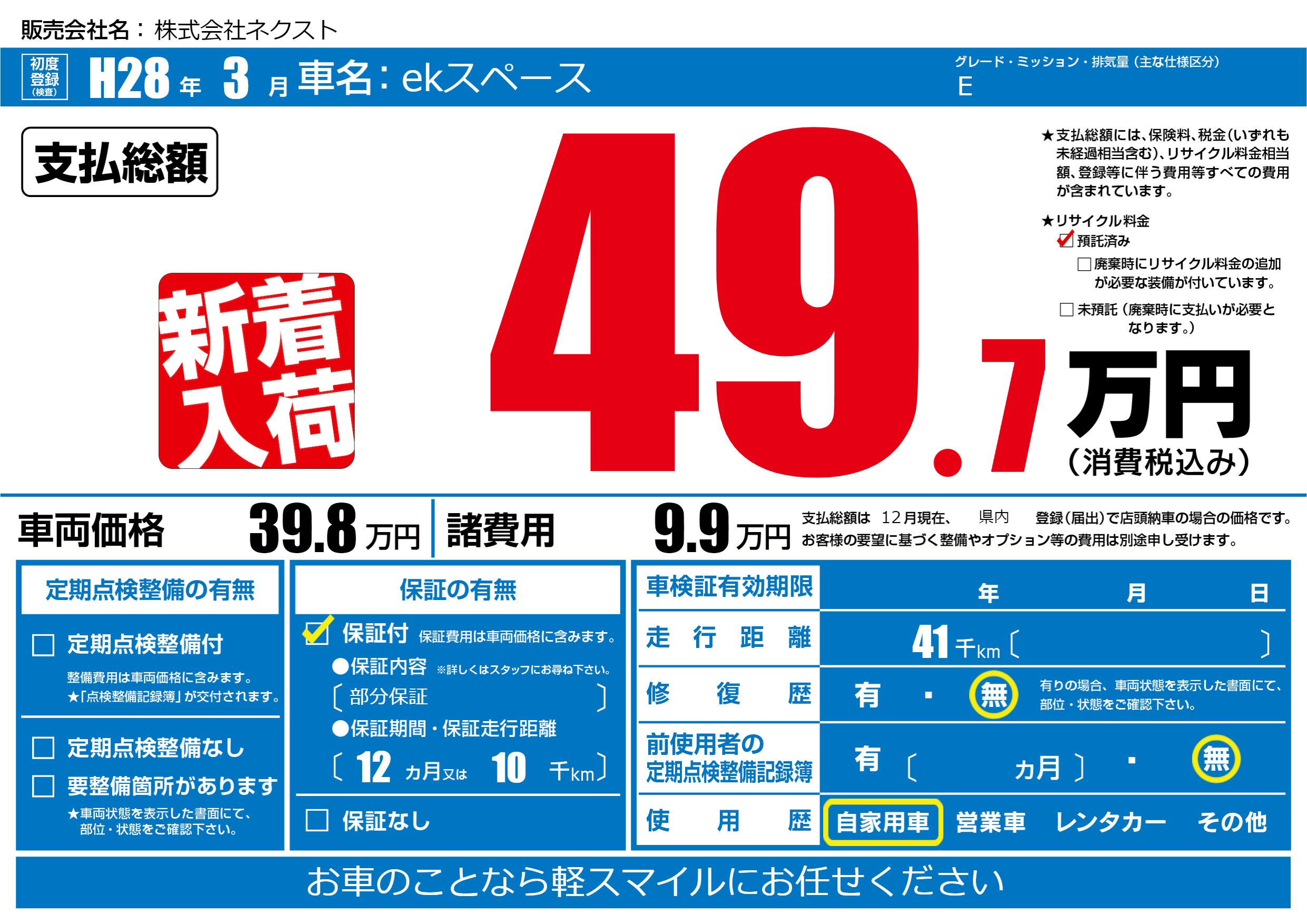 | 車名 | ekスペース | グレード ミッション 排気量 |