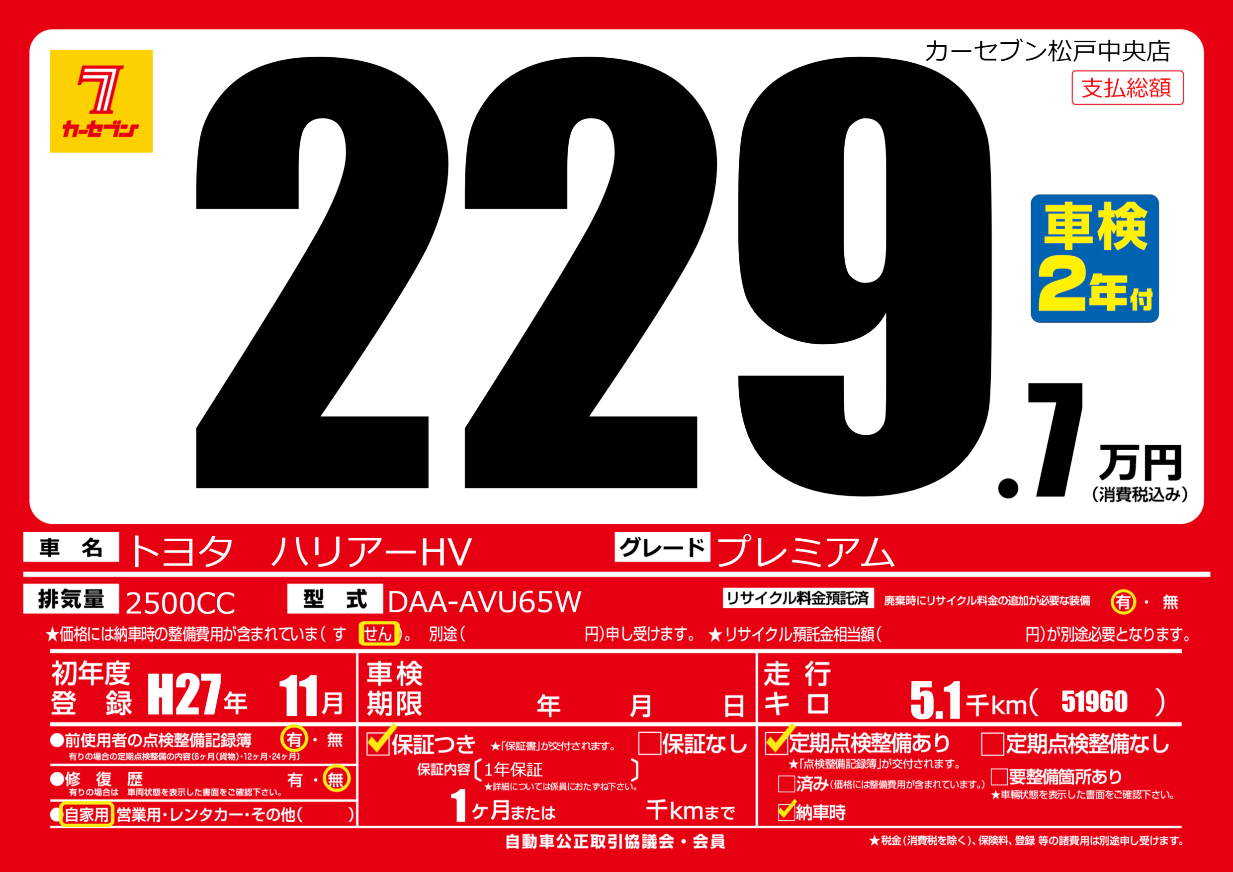 | 車名 | トヨタ ハリアーHV | グレード ミッション 排気量 |