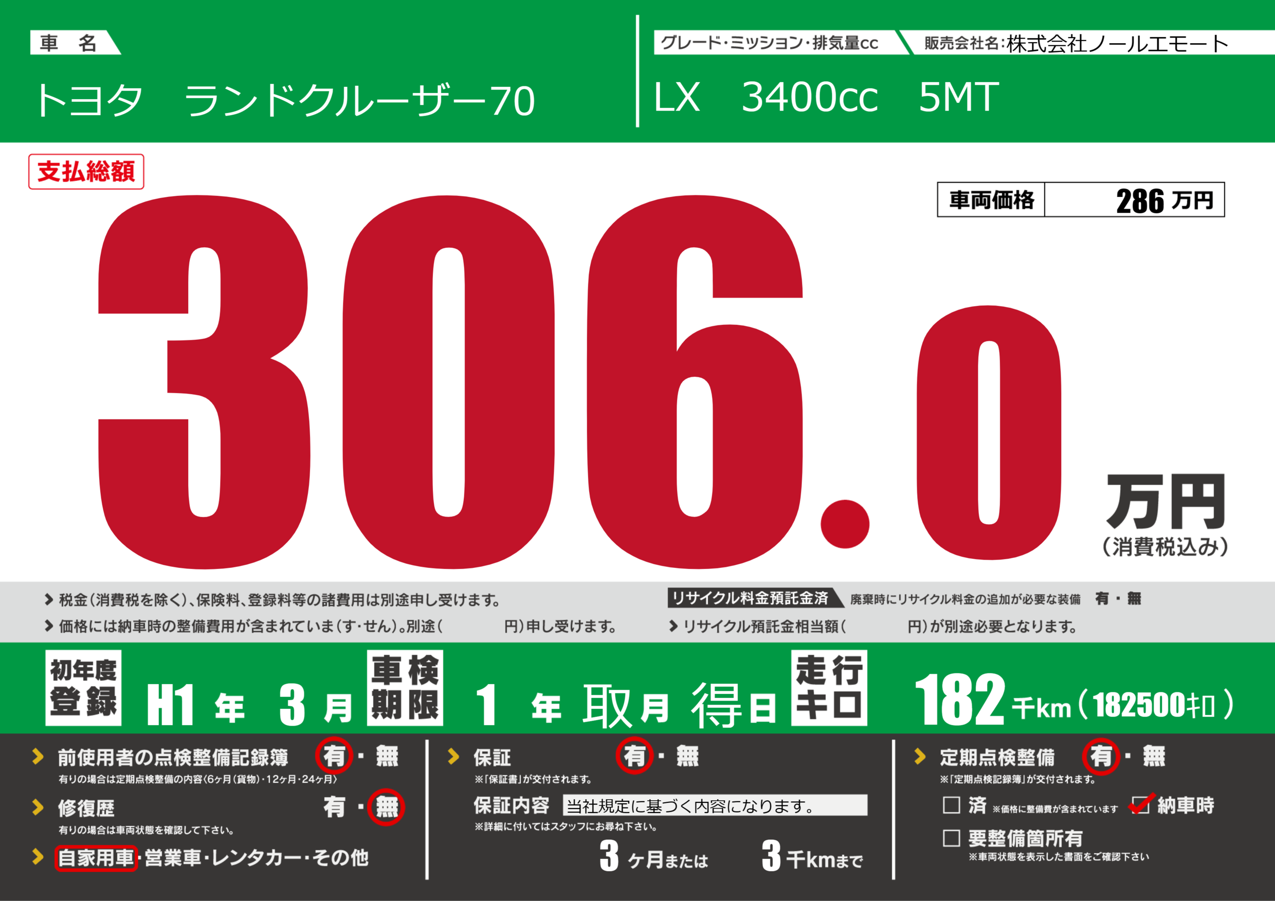 | 車名 | トヨタ ランドクルーザー70 | グレード ミッション 排気量 |