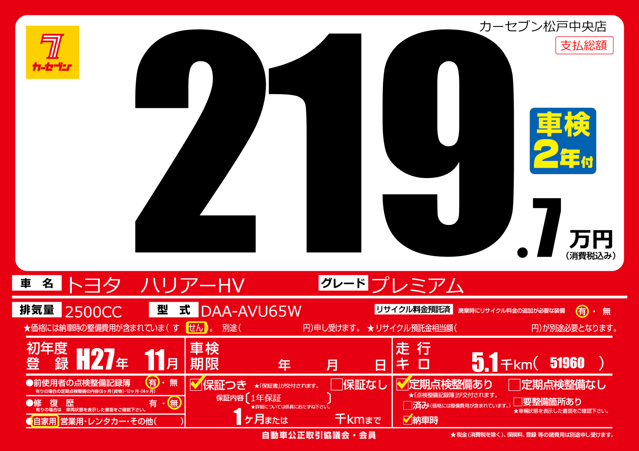 | 車名 | トヨタ ハリアーHV | グレード ミッション 排気量 |