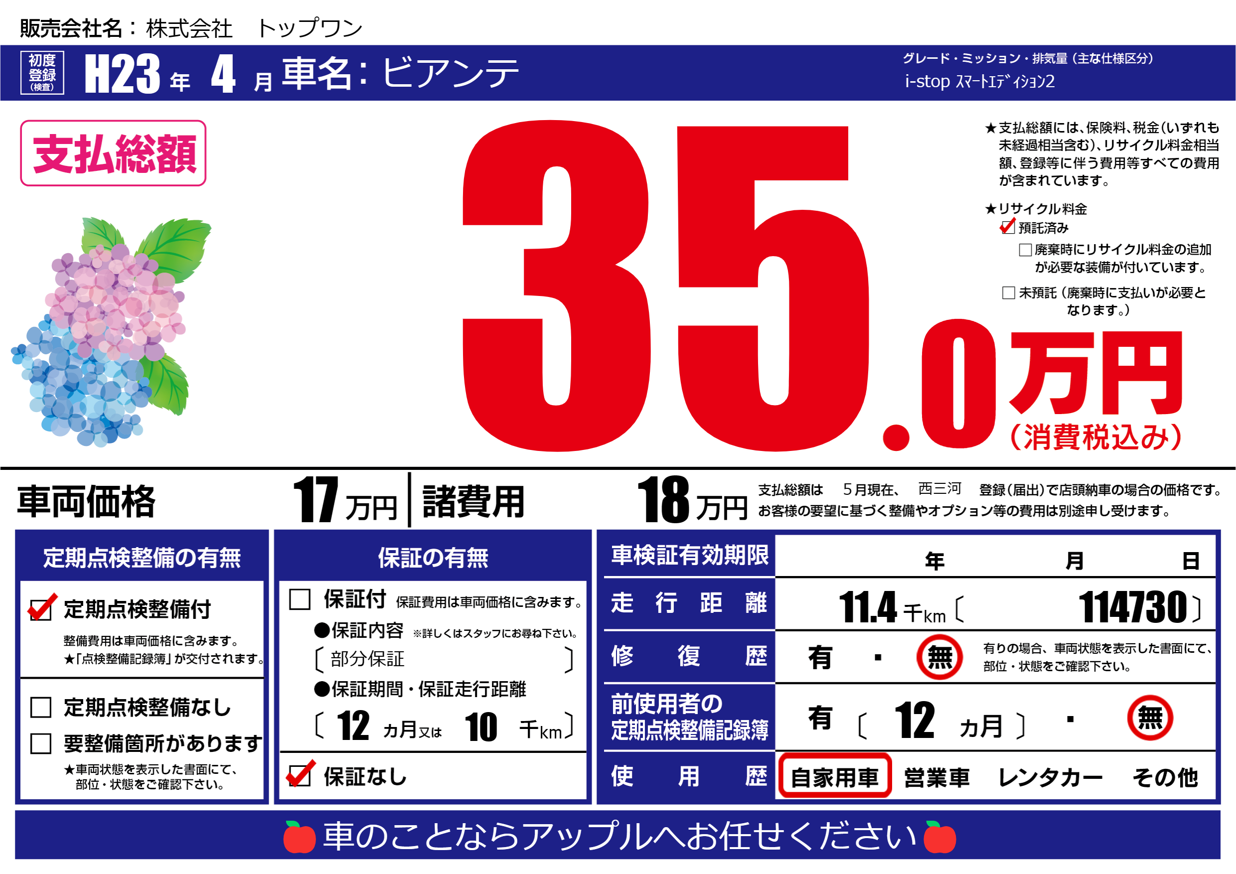 | 車名 | ビアンテ | グレード ミッション 排気量 |