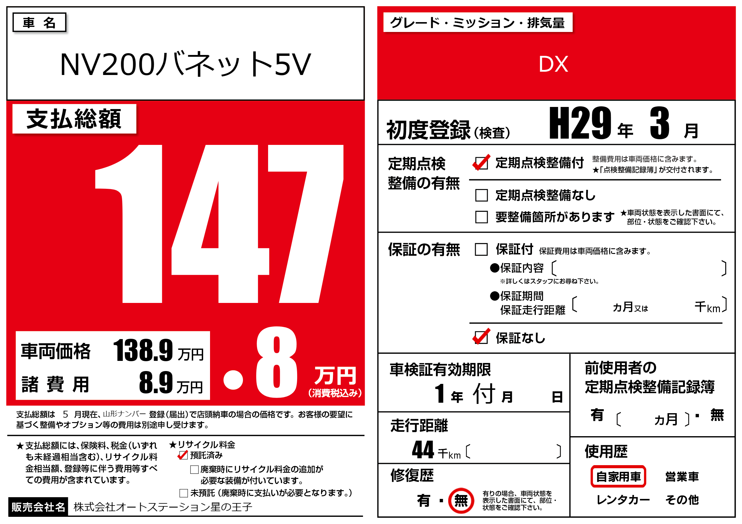 | 車名 | NV200バネット5V | グレード ミッション 排気量 |