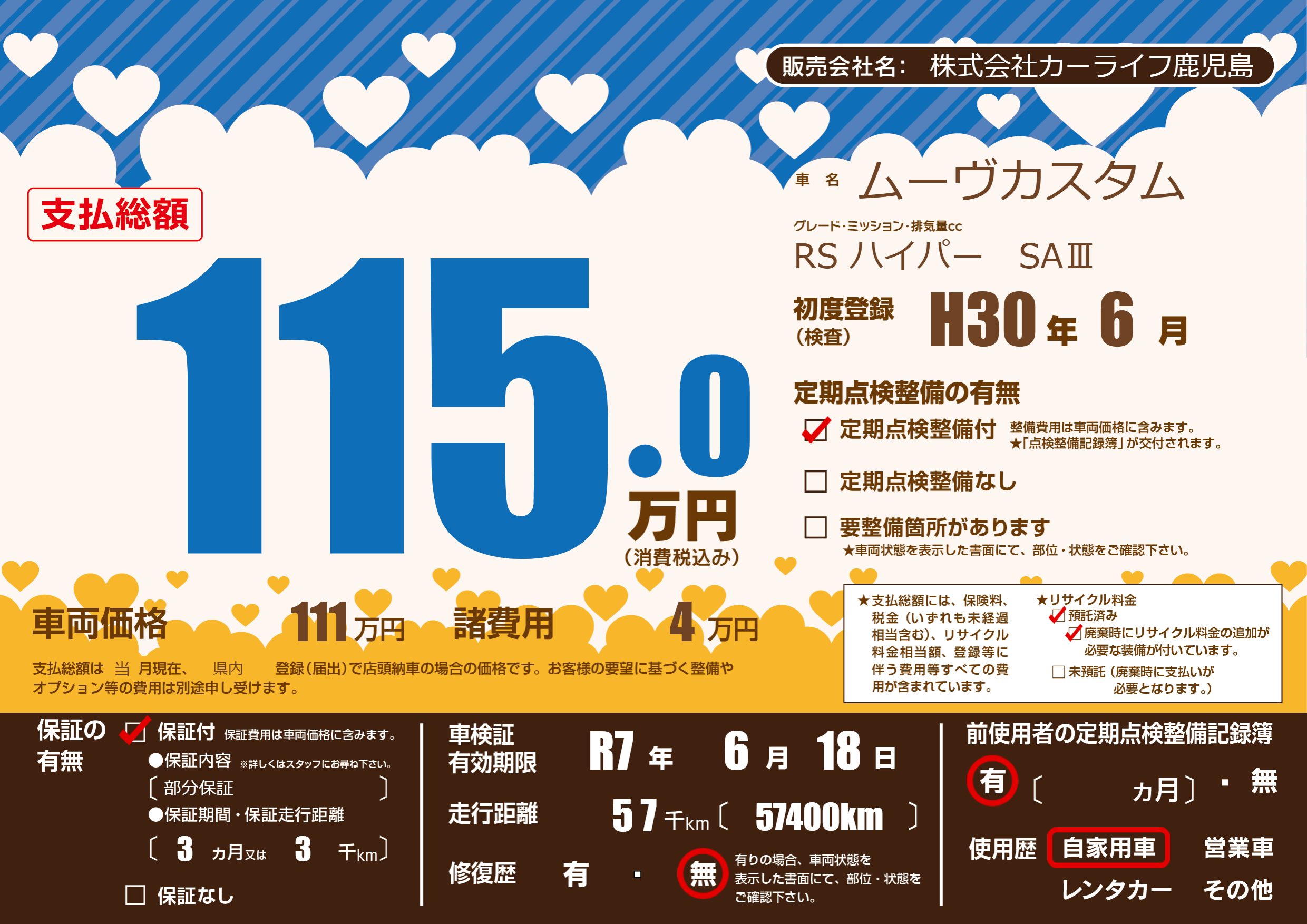 | 走行キロ | 0.5万km | 初年度登録 | H30年6月 |