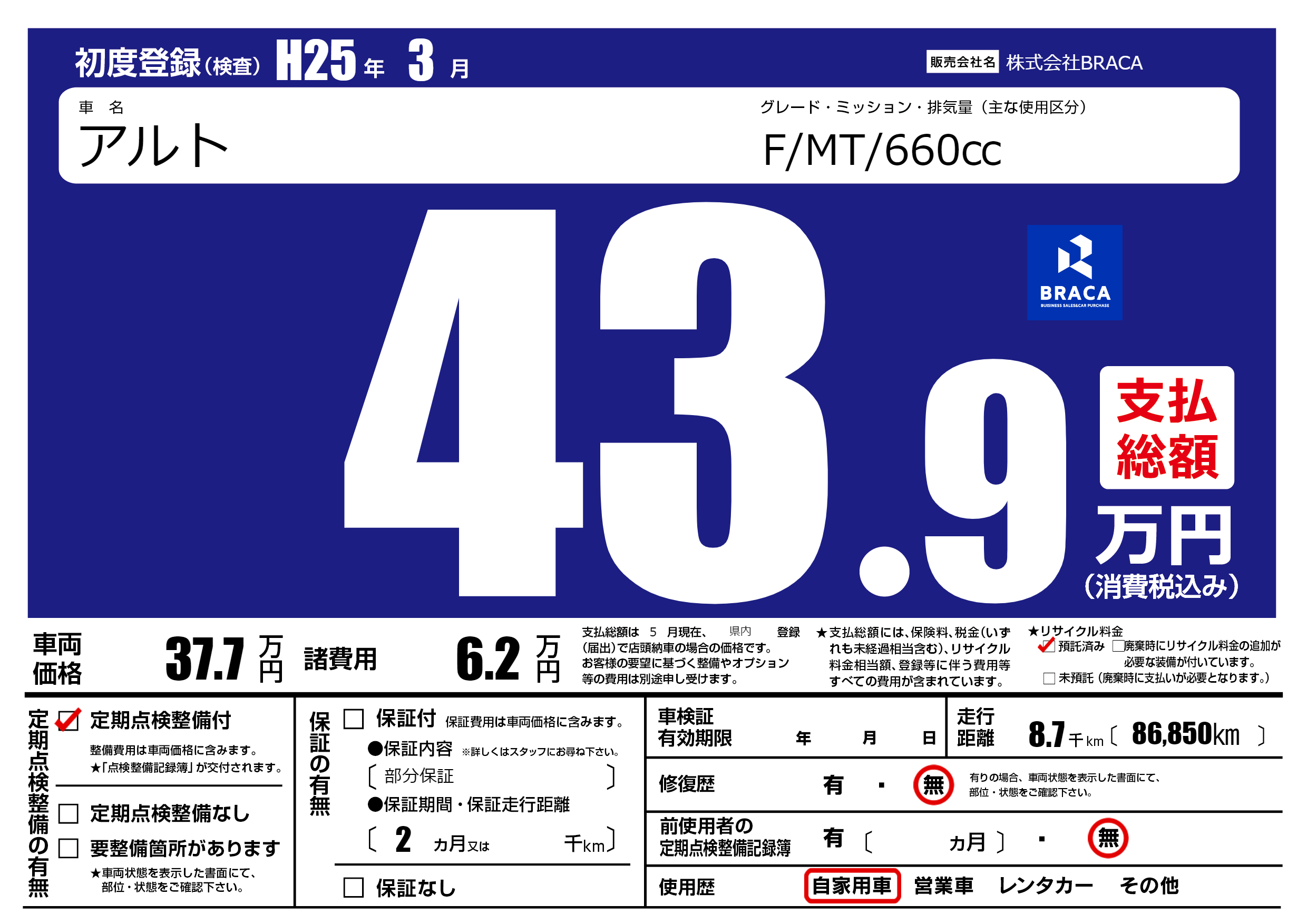 | 走行キロ | 0.8万km | 初年度登録 | H25年3月 |