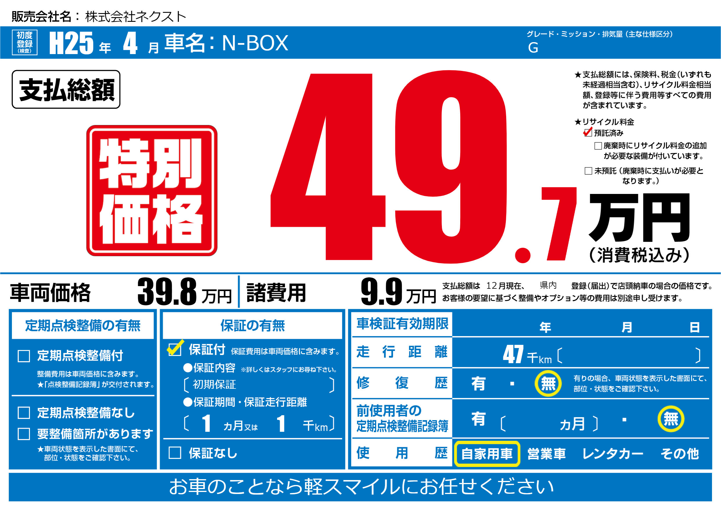 | 走行キロ | 4.7万km | 初年度登録 | H25年4月 |