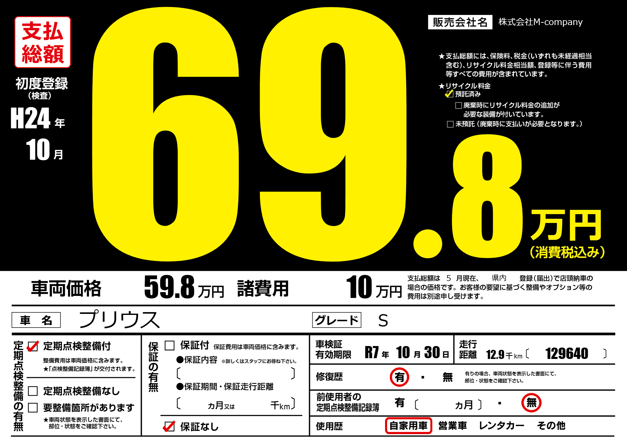 | 車名 | プリウス | グレード ミッション 排気量 |
