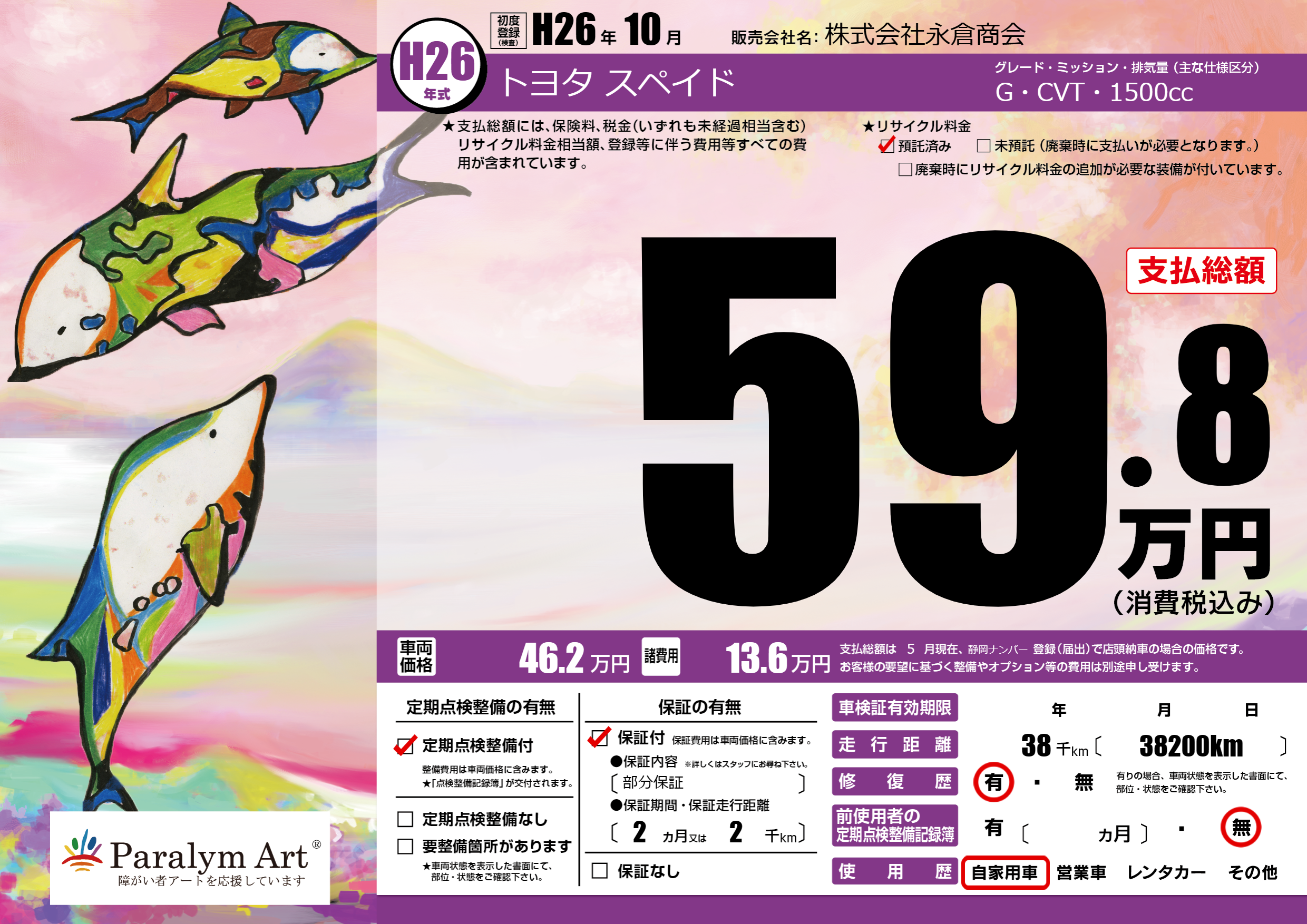 | 車名 | トヨタ スペイド | グレード ミッション 排気量 |
