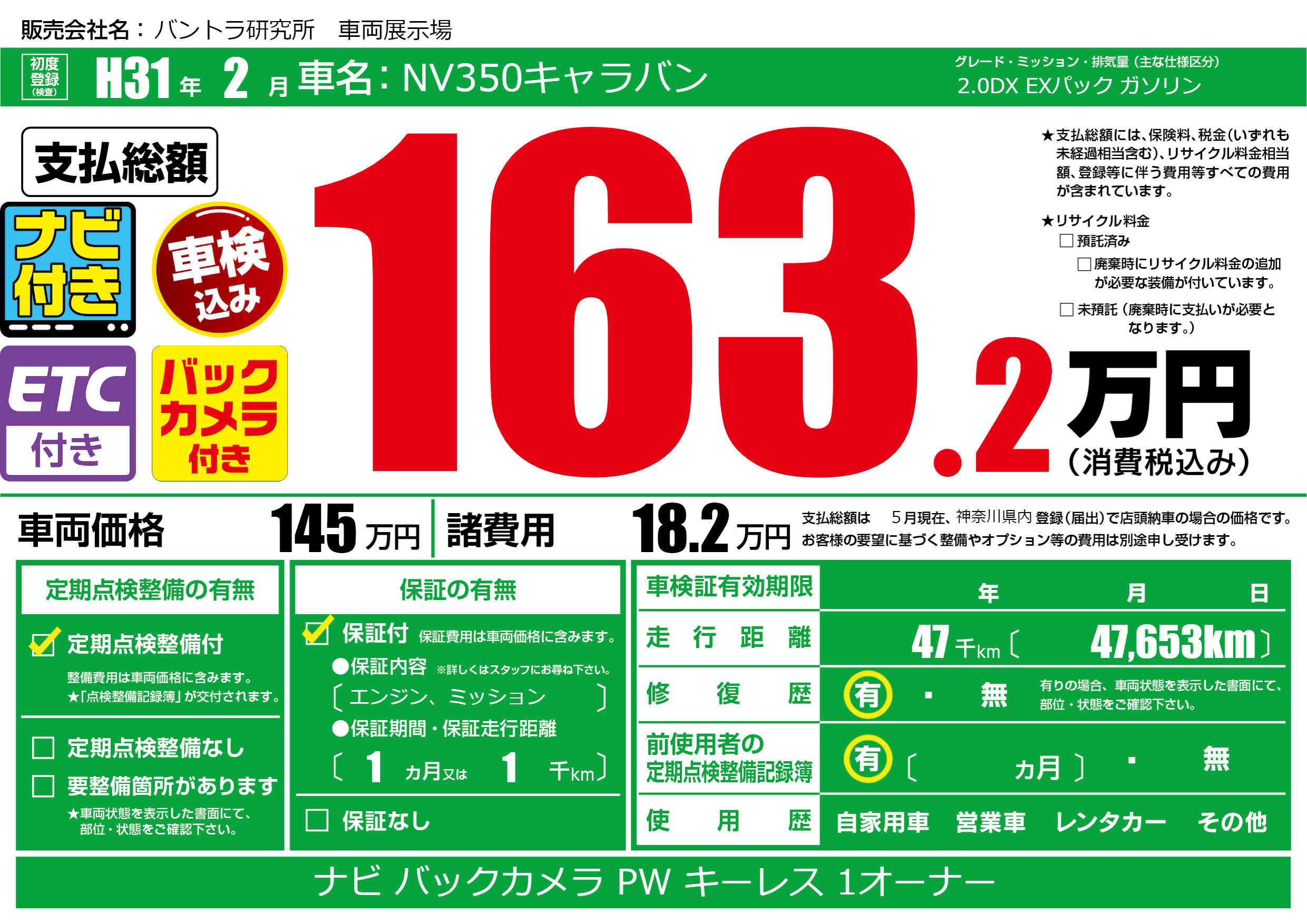 | 車名 | NV350キャラバン | グレード ミッション 排気量 |