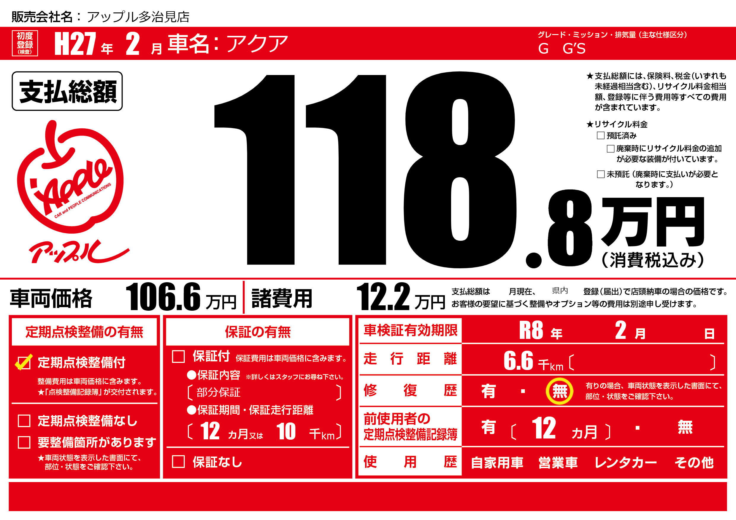 | 走行キロ | 0.6万km | 初年度登録 | H27年2月 |