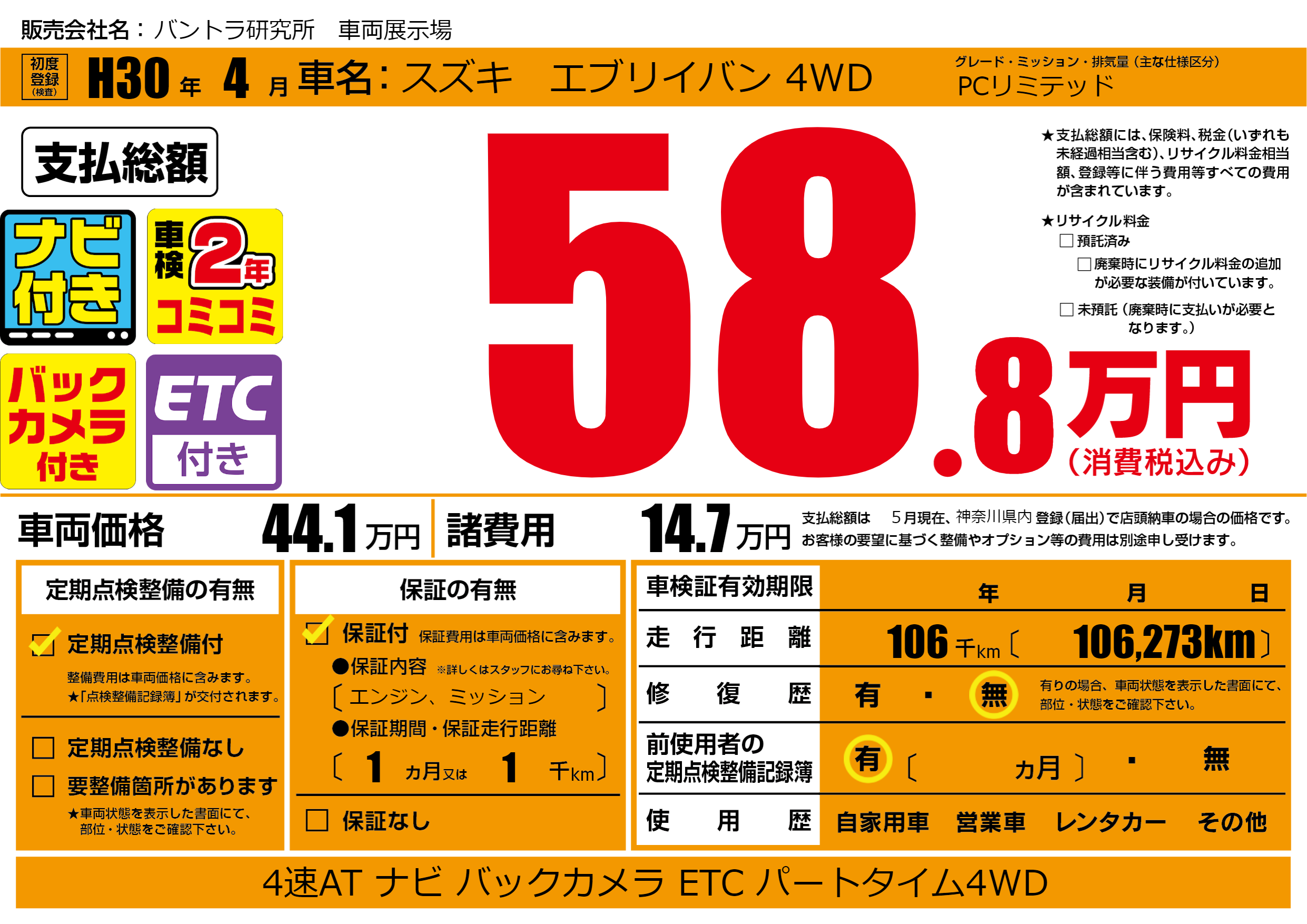 | 車名 | スズキ エブリイバン 4WD | グレード ミッション 排気量 |