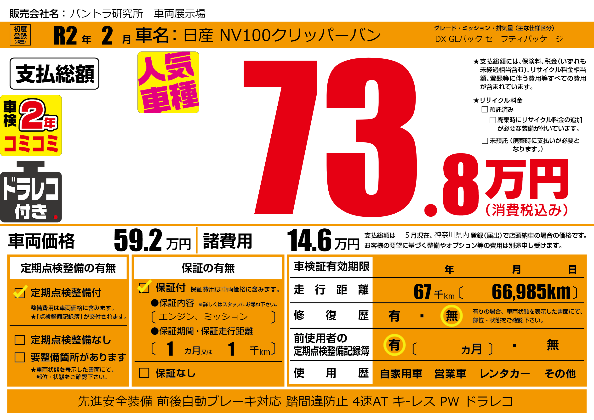 | 車名 | 日産 NV100クリッパーバン | グレード ミッション 排気量 |