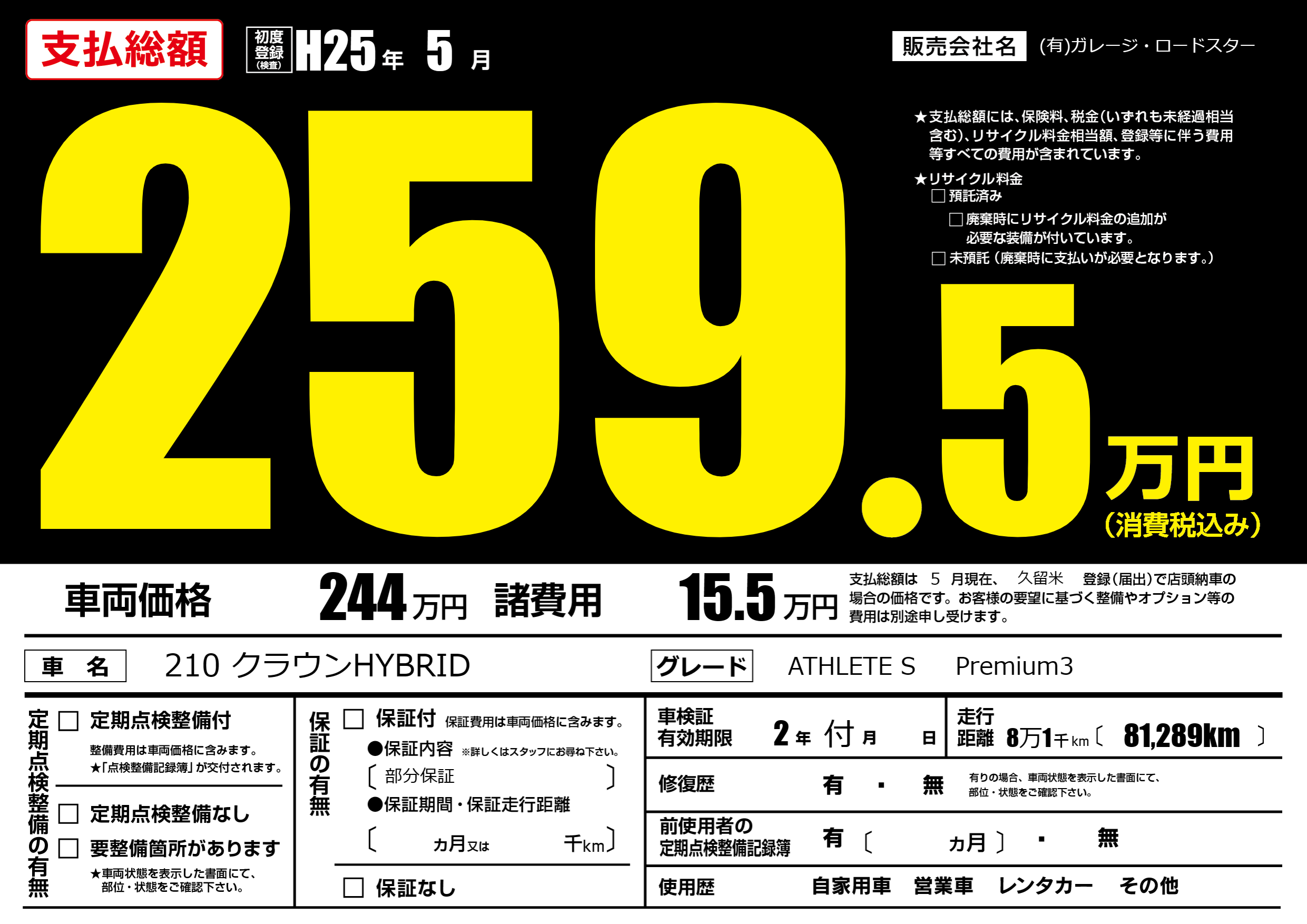| 車名 | 210 クラウンHYBRID | グレード ミッション 排気量 |