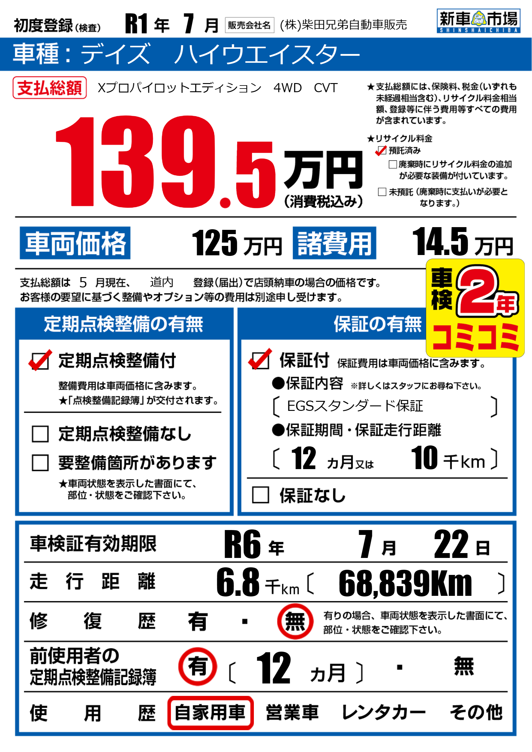 | 走行キロ | 0.6万km | 初年度登録 | R1年7月 |