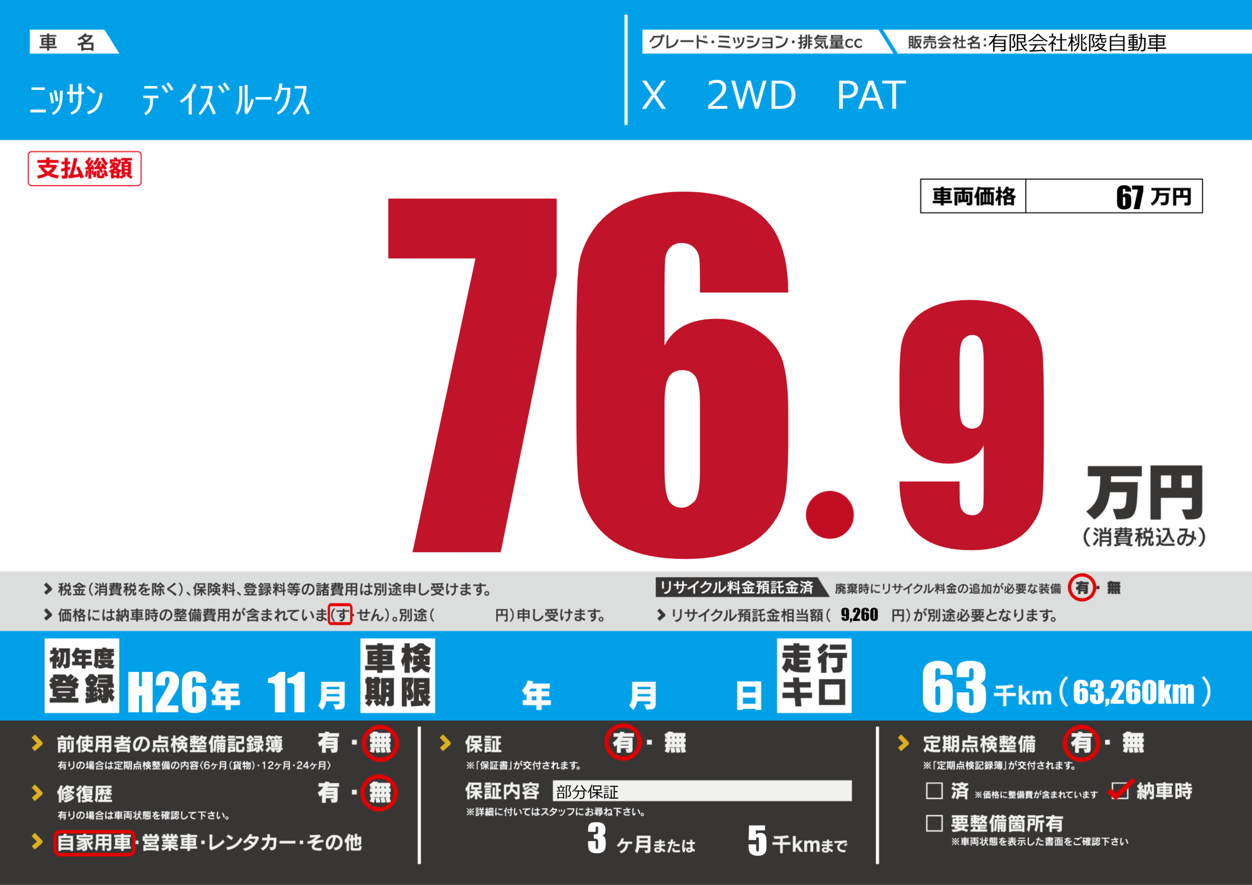 保証付き 保証内容(部分保証) 3ヶ月または(5)千kmまで |