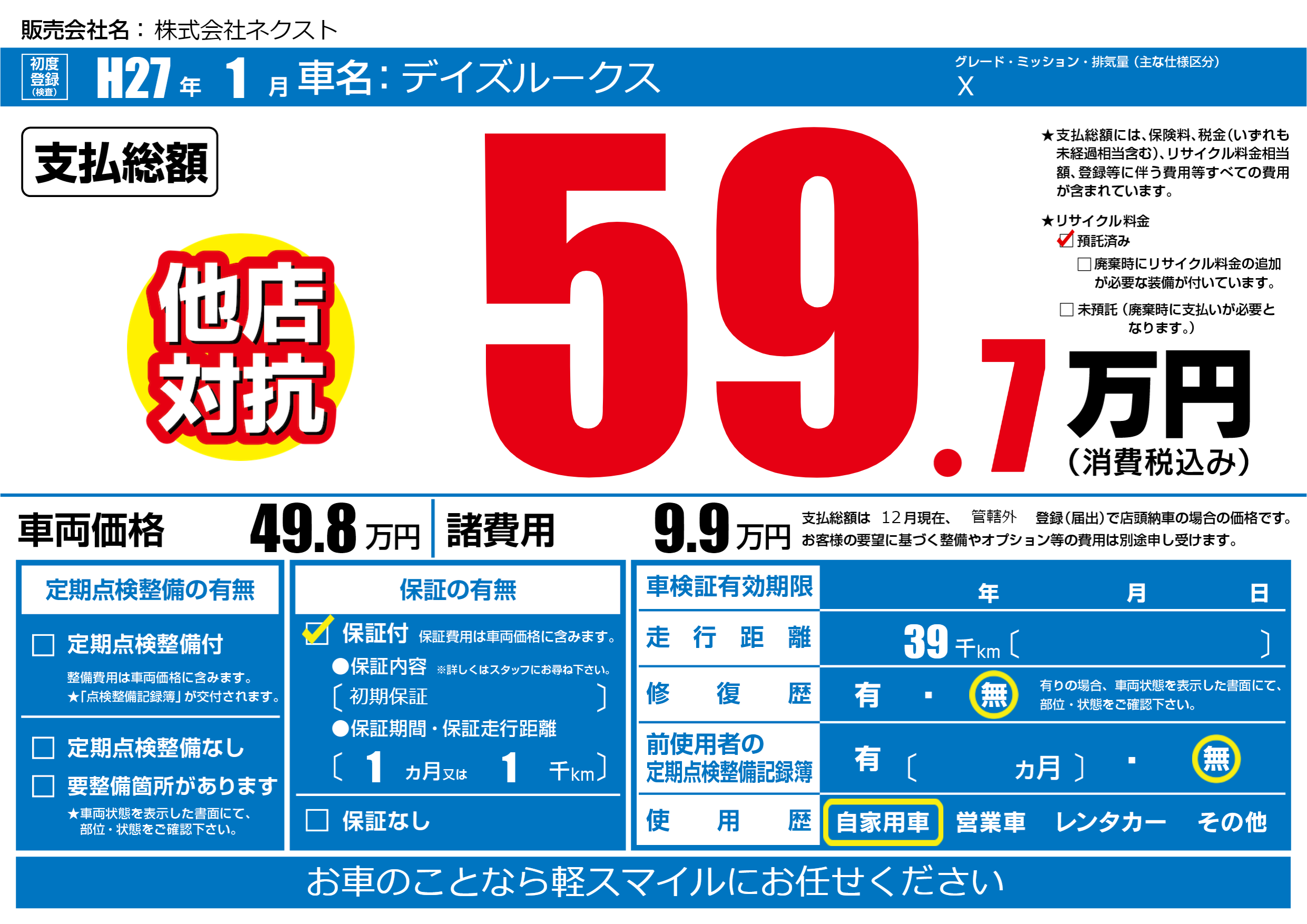 | 走行キロ | 3.9万km | 初年度登録 | H27年1月 |