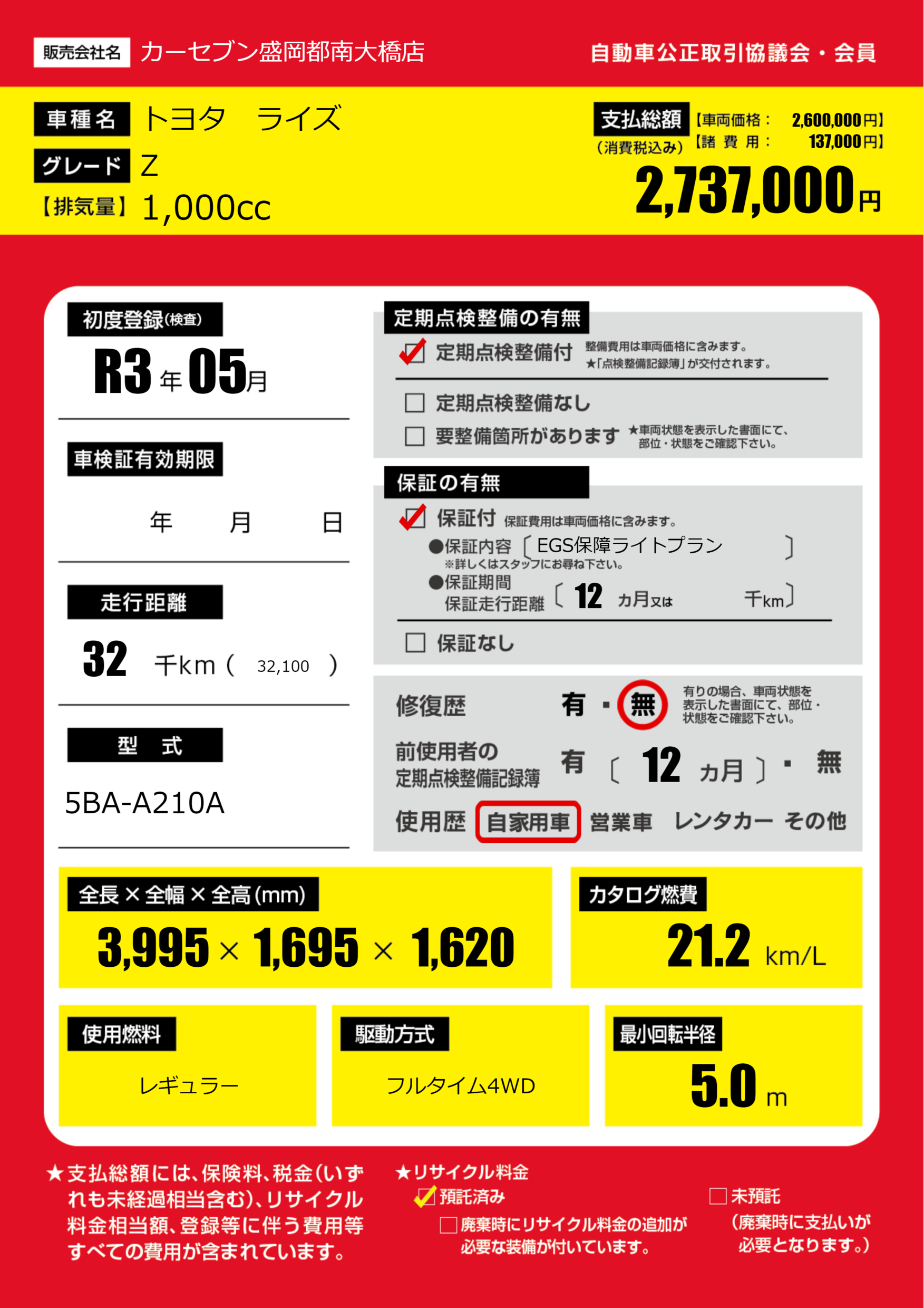 | 車名 | トヨタ ライズ | グレード ミッション 排気量 |