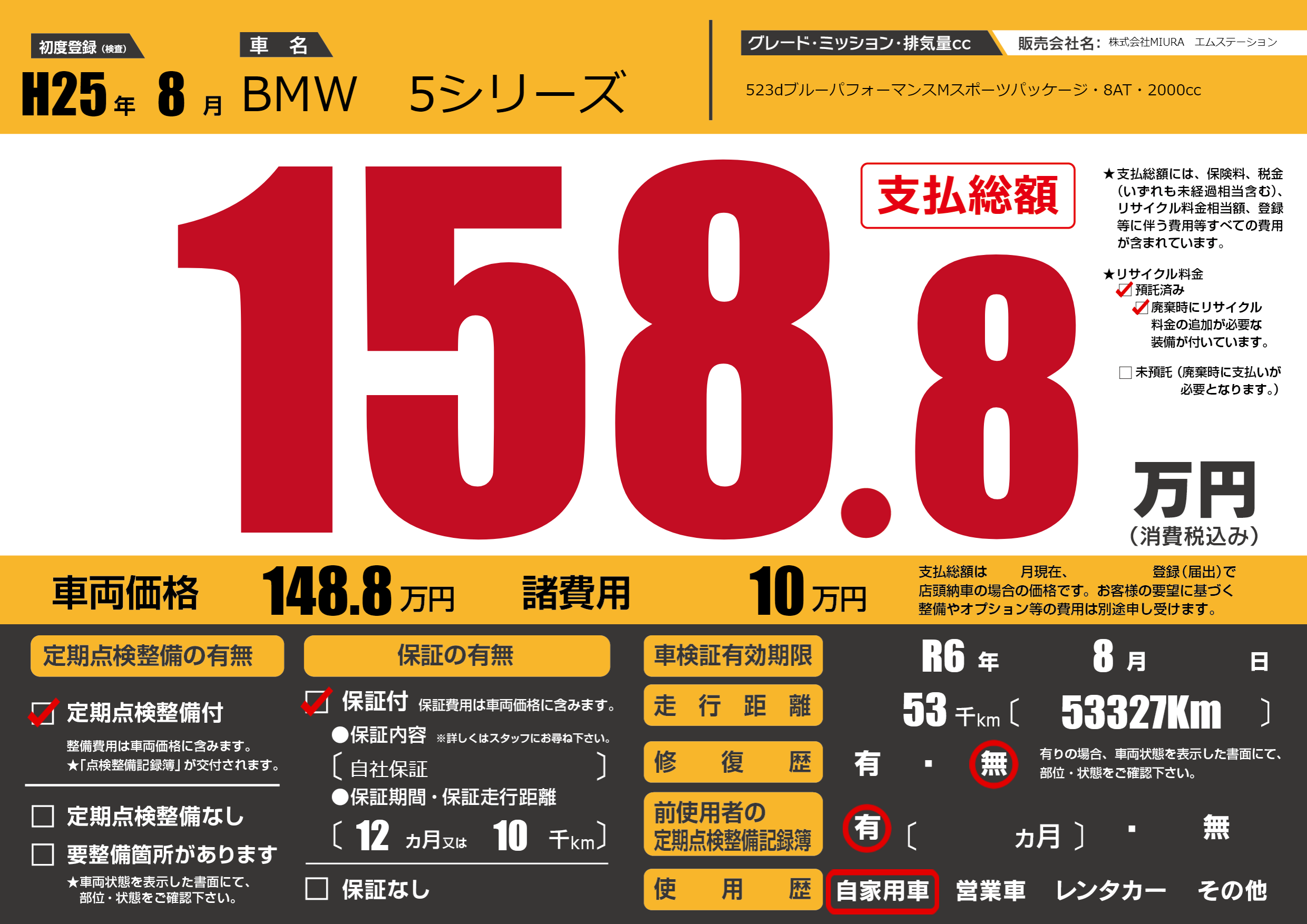 | 車名 | BMW 5シリーズ | グレード ミッション 排気量 |