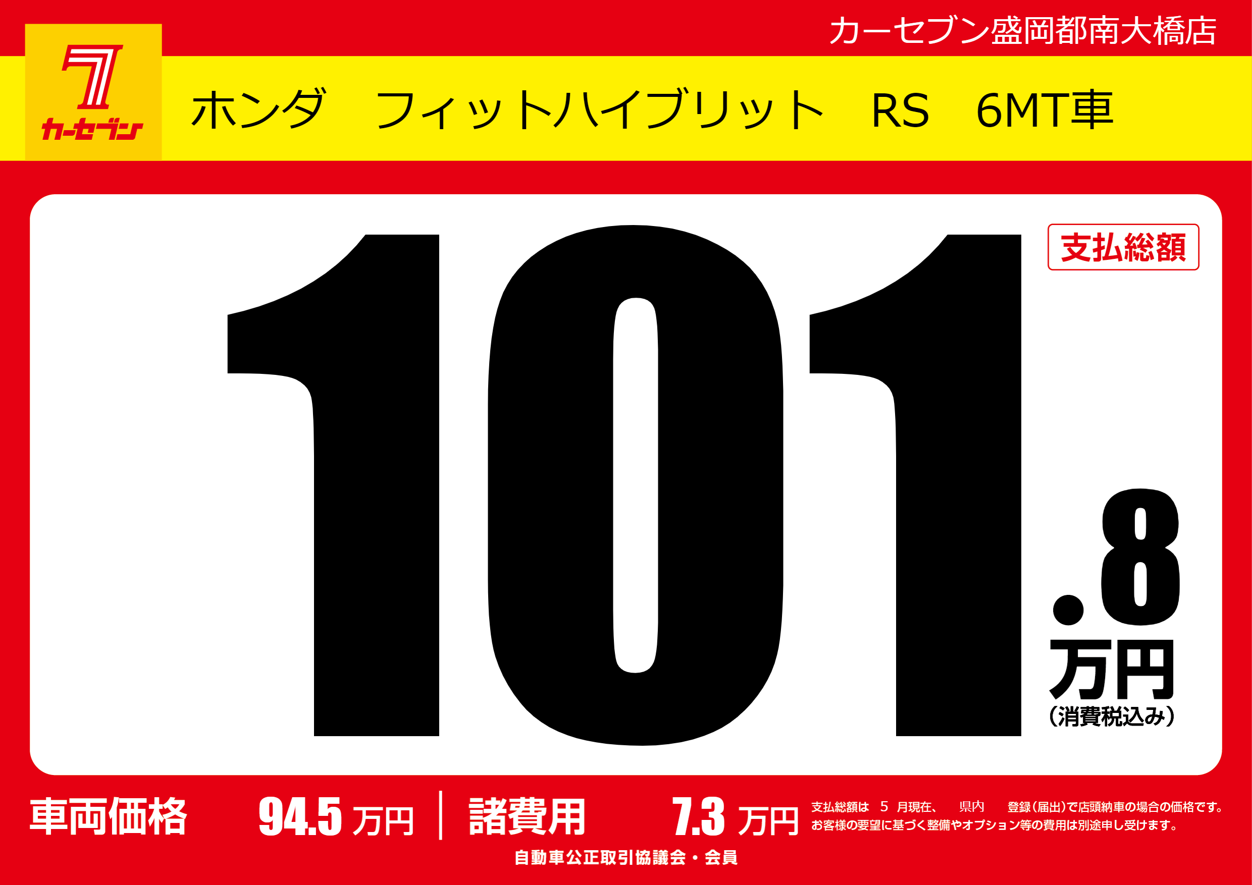 | 車名 | ホンダ フィットハイブリット RS 6MT車 | グレード ミッション 排気量 |
