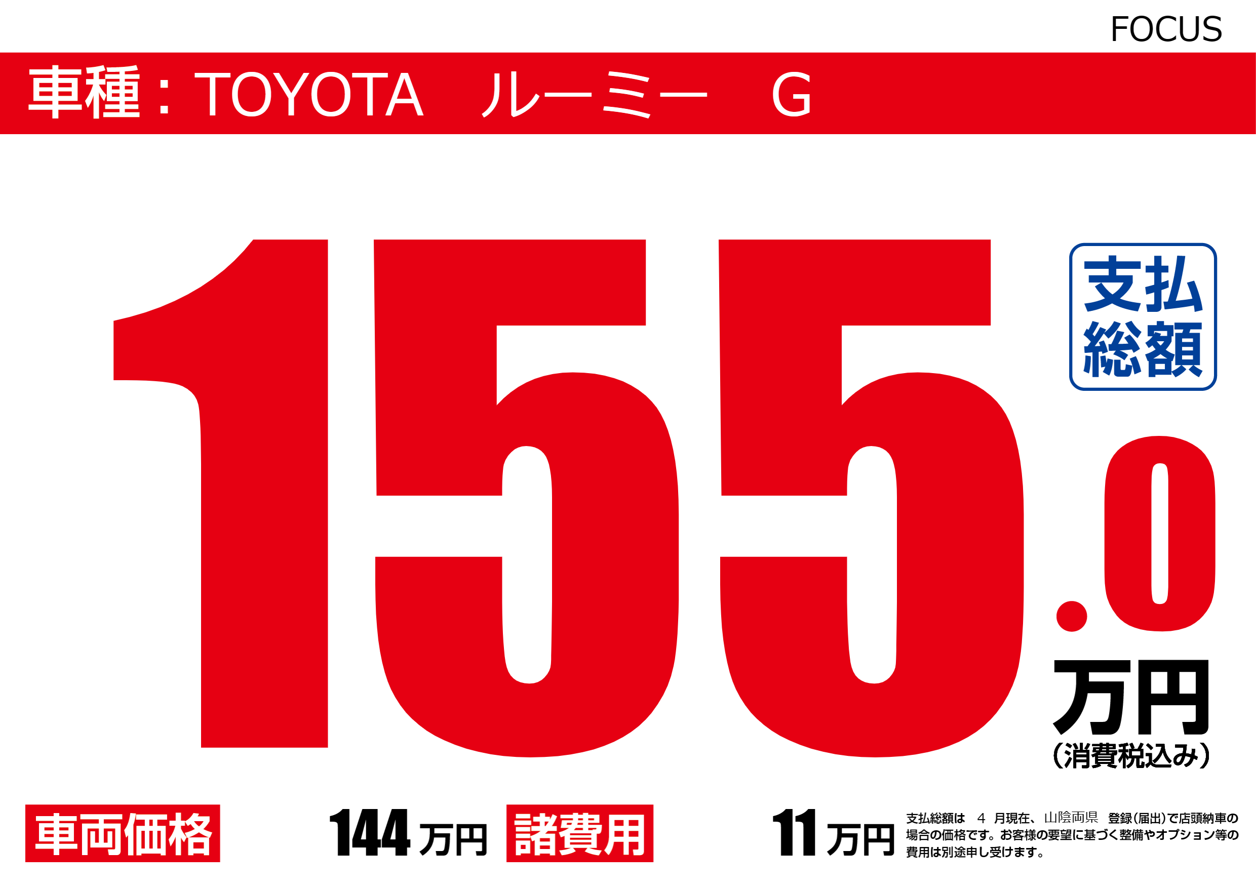 | 車名 | TOYOTA ルーミー G | グレード ミッション 排気量 |