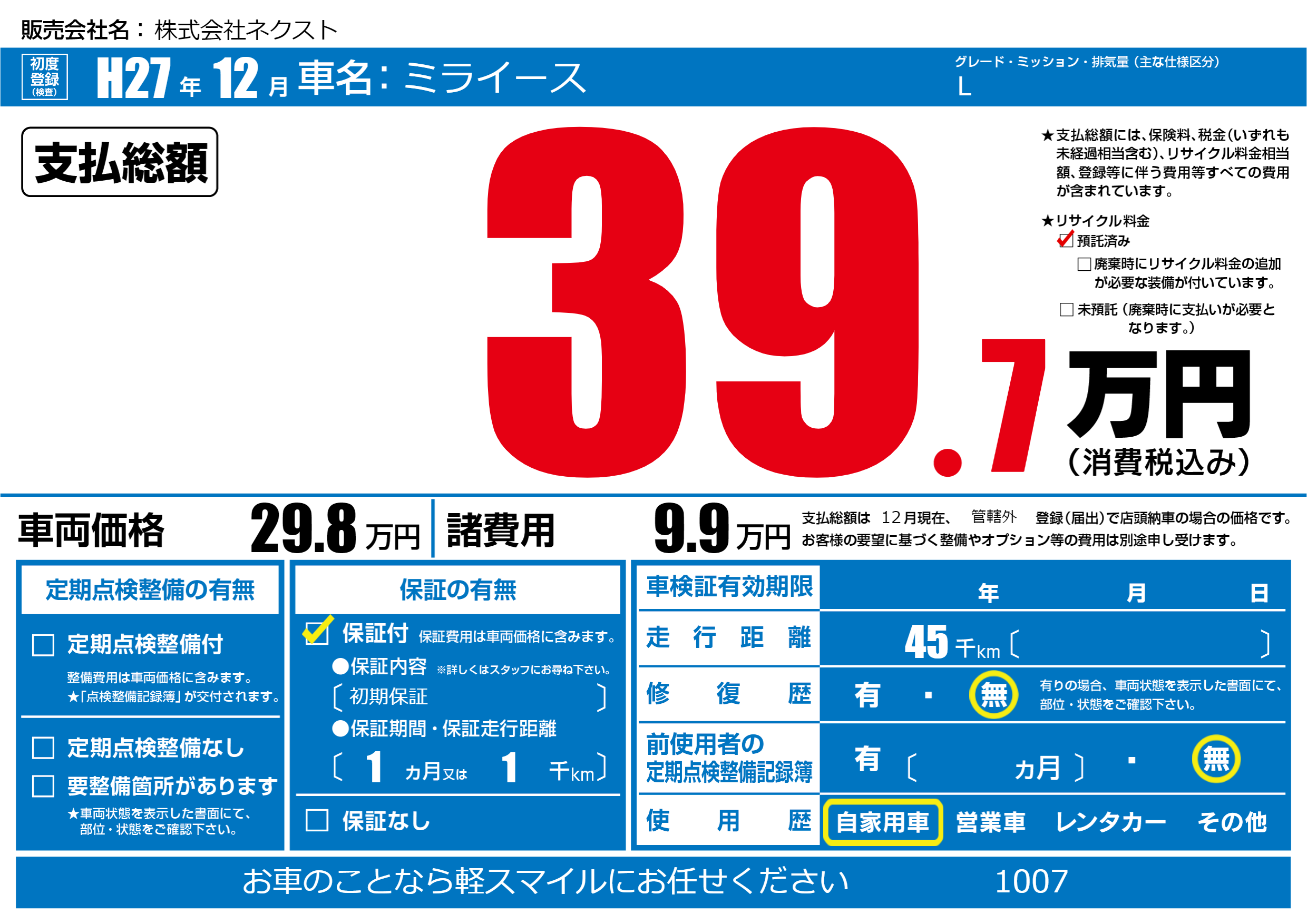 保証付き 保証内容(初期保証) 1ヶ月または(1)千kmまで |
