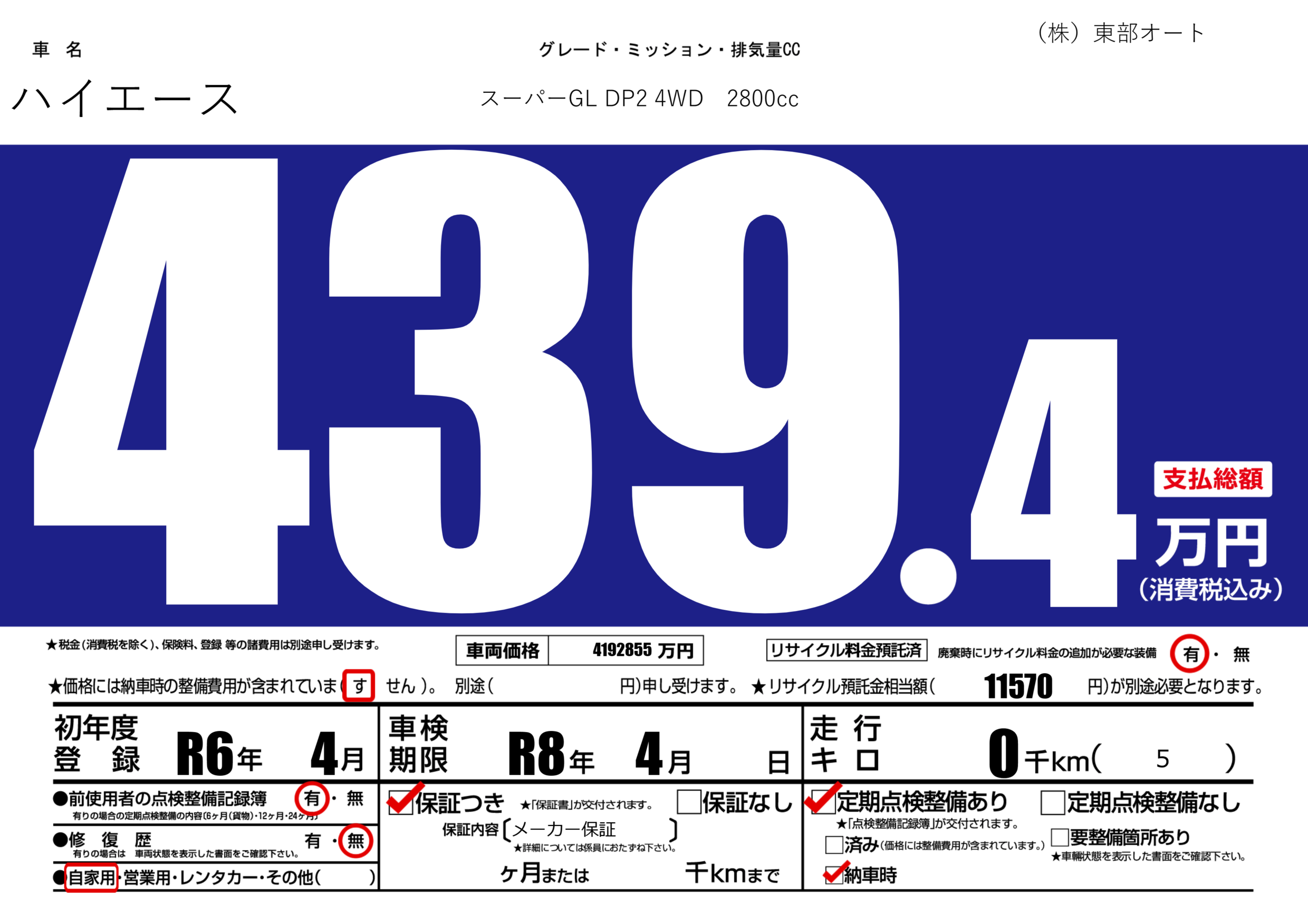| 車名 | ハイエース | グレード ミッション 排気量 |