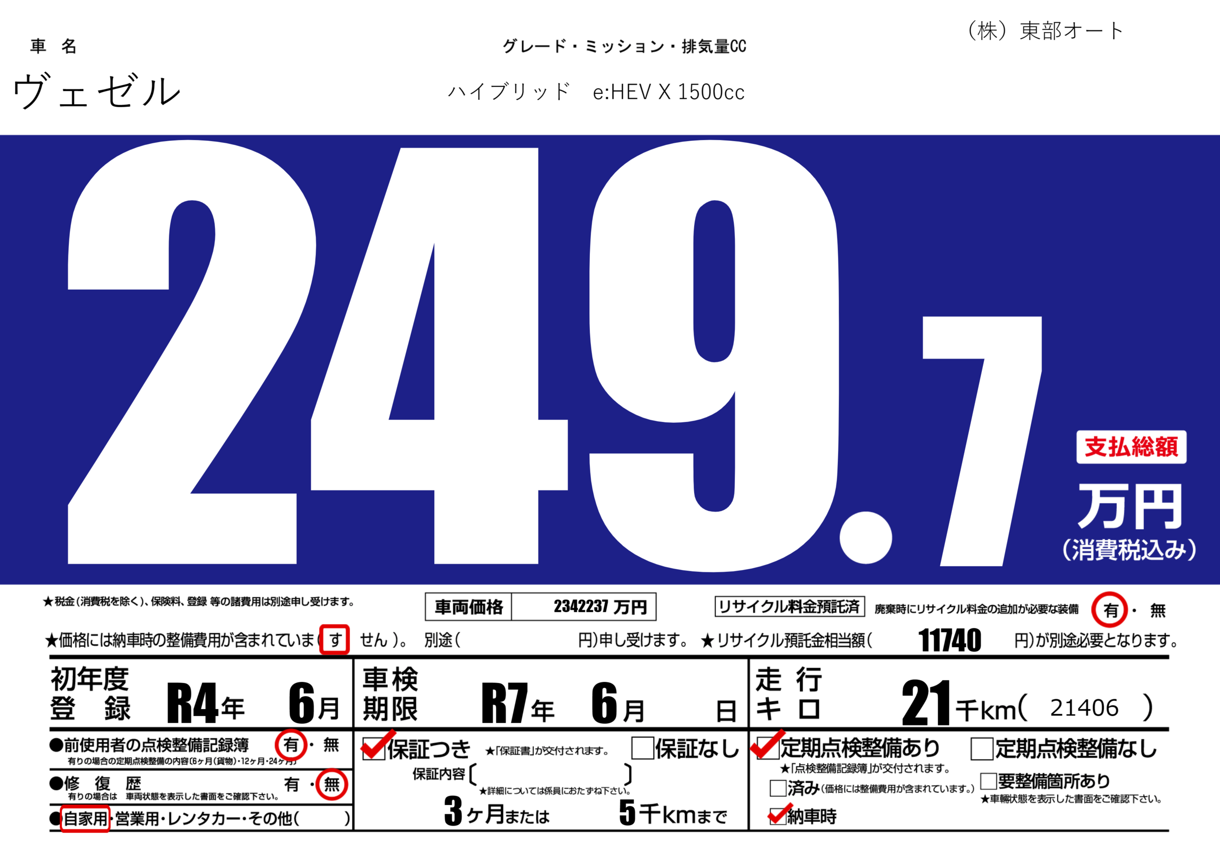 | 車名 | ヴェゼル | グレード ミッション 排気量 |