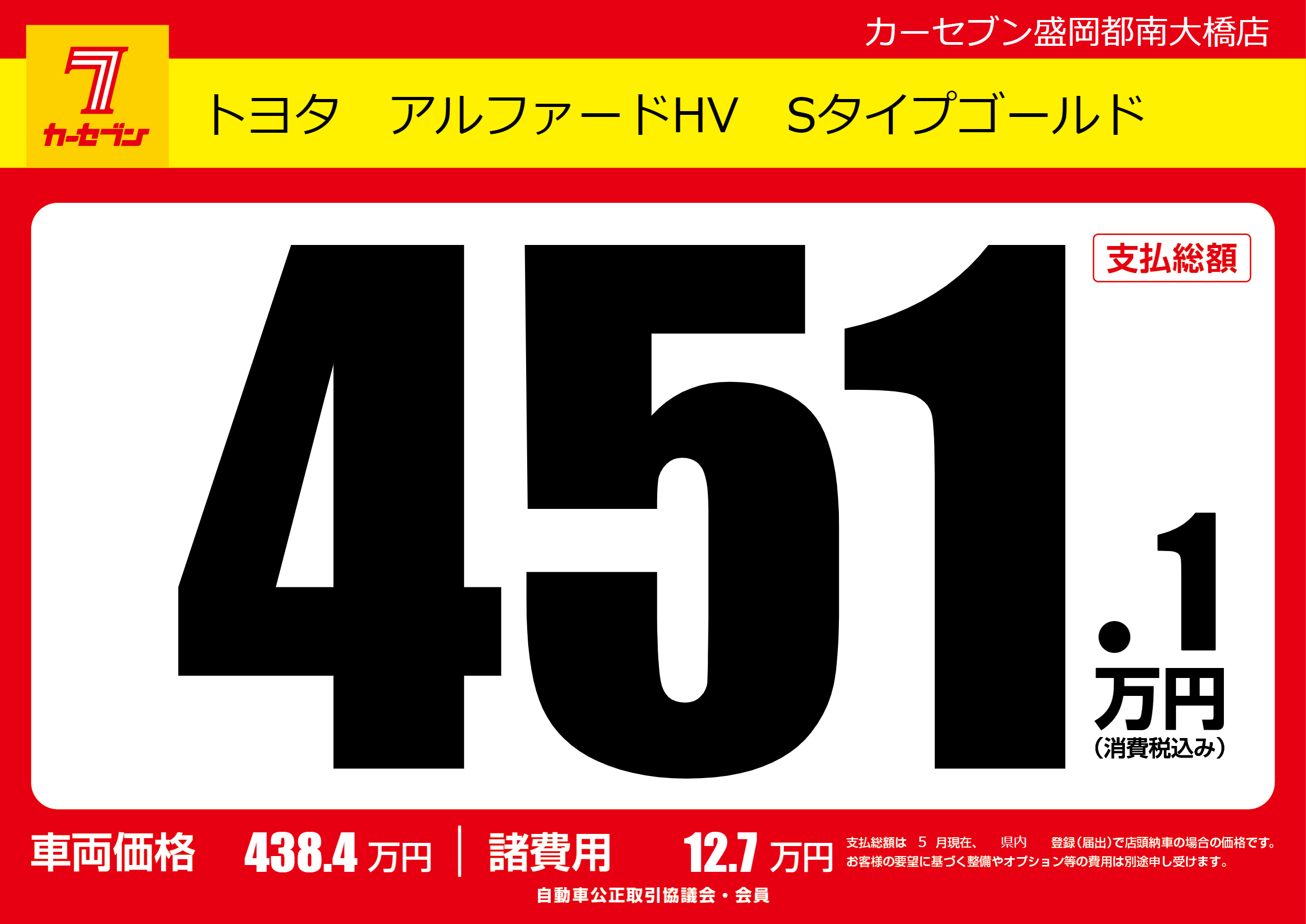 | 車名 | トヨタ アルファードHV Sタイプゴールド | グレード ミッション 排気量 |