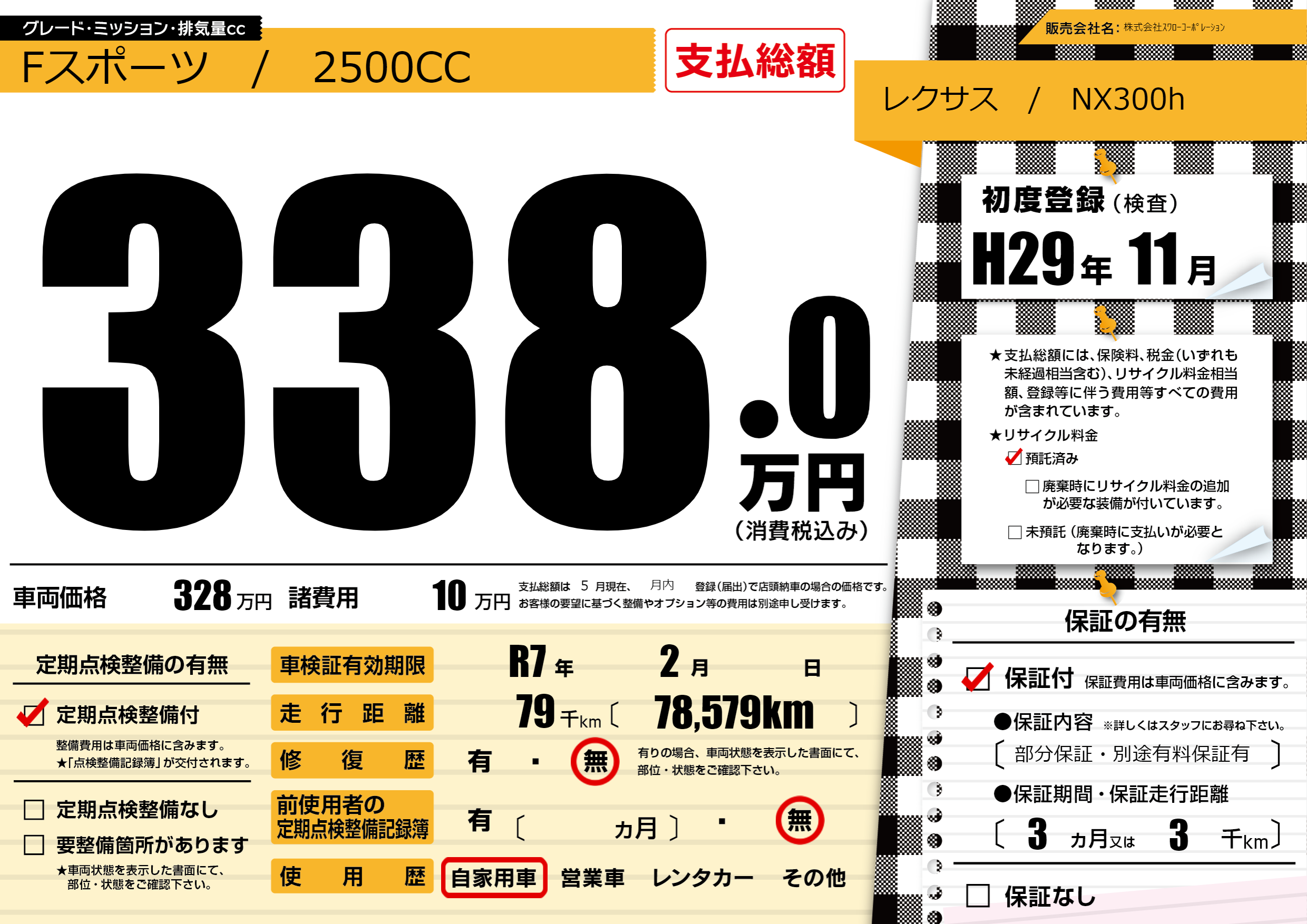 | 車名 | レクサス / NX300h | グレード ミッション 排気量 |