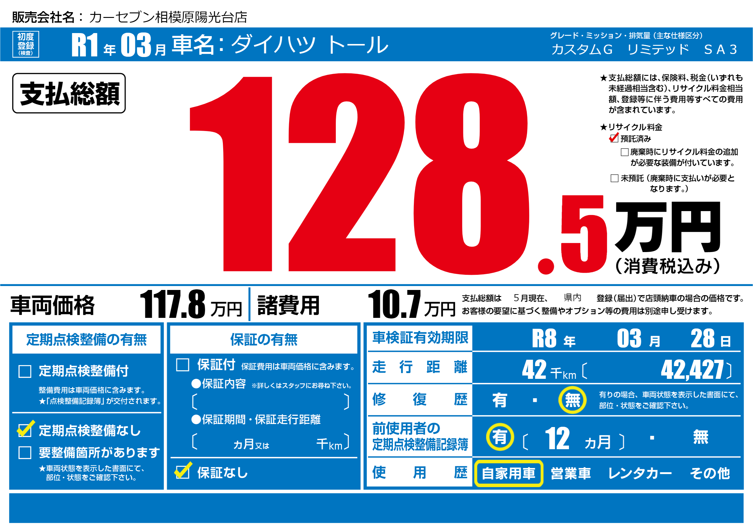 | 走行キロ | 4.2万km | 初年度登録 | R1年03月 |