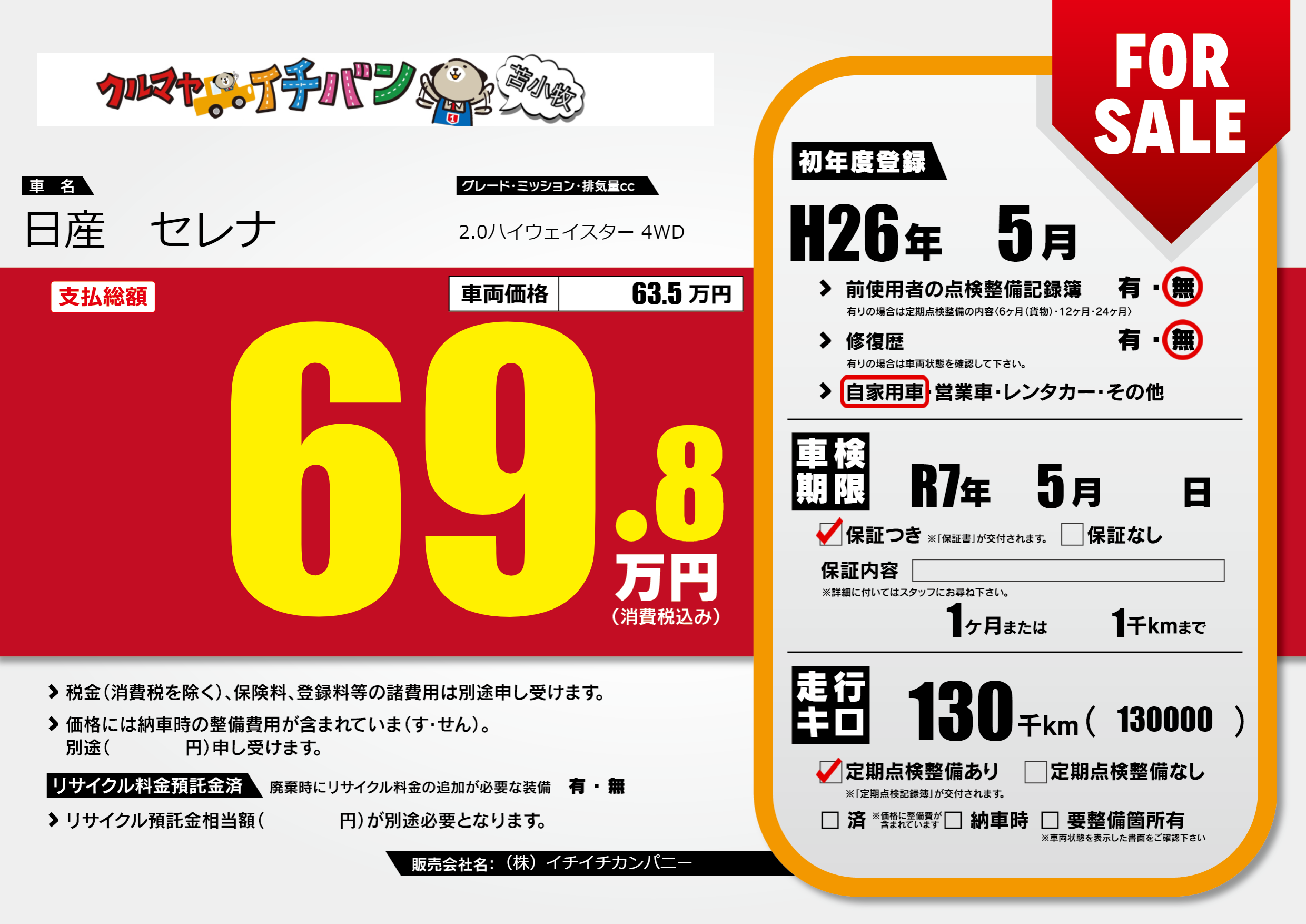 | 走行キロ | 13万km | 初年度登録 | H26年5月 |