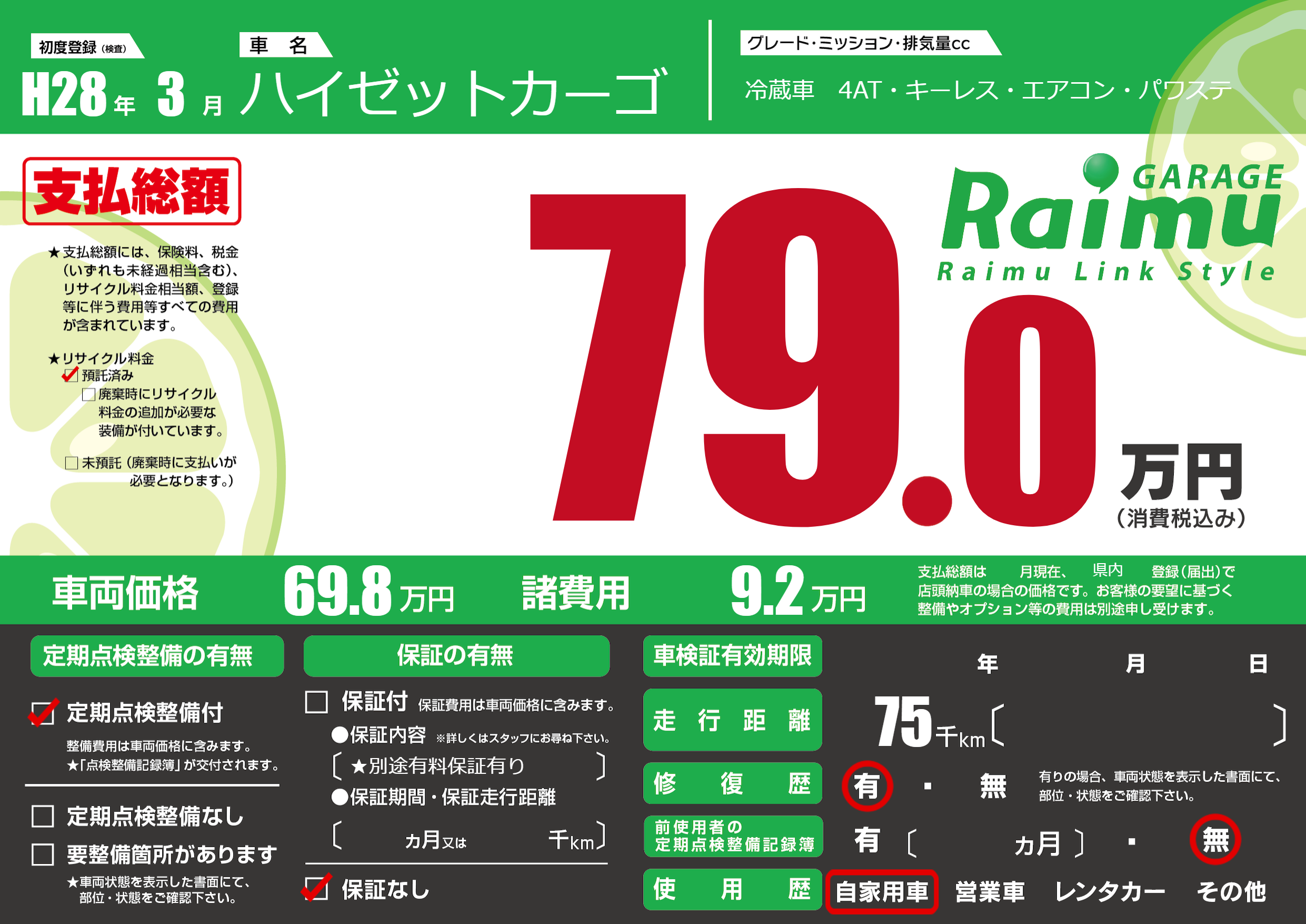 保証なし 保証内容(★別途有料保証有り) ---ヶ月または()千kmまで |