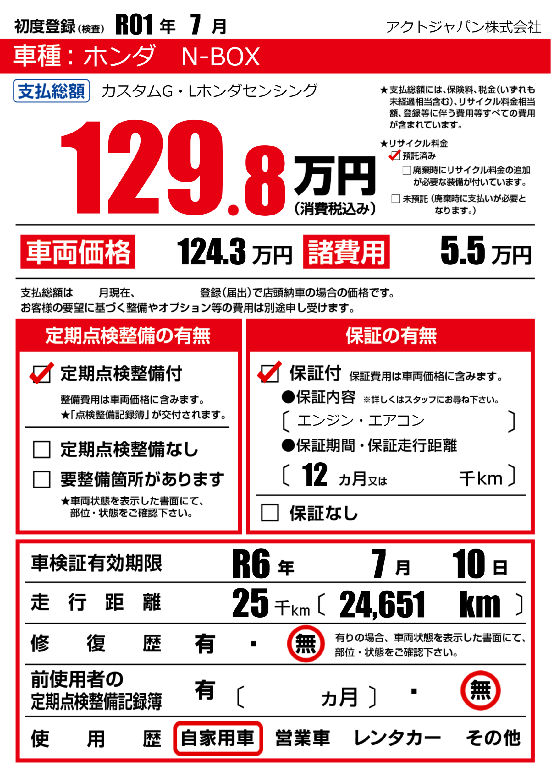 | 車名 | ホンダ N-BOX | グレード ミッション 排気量 |
