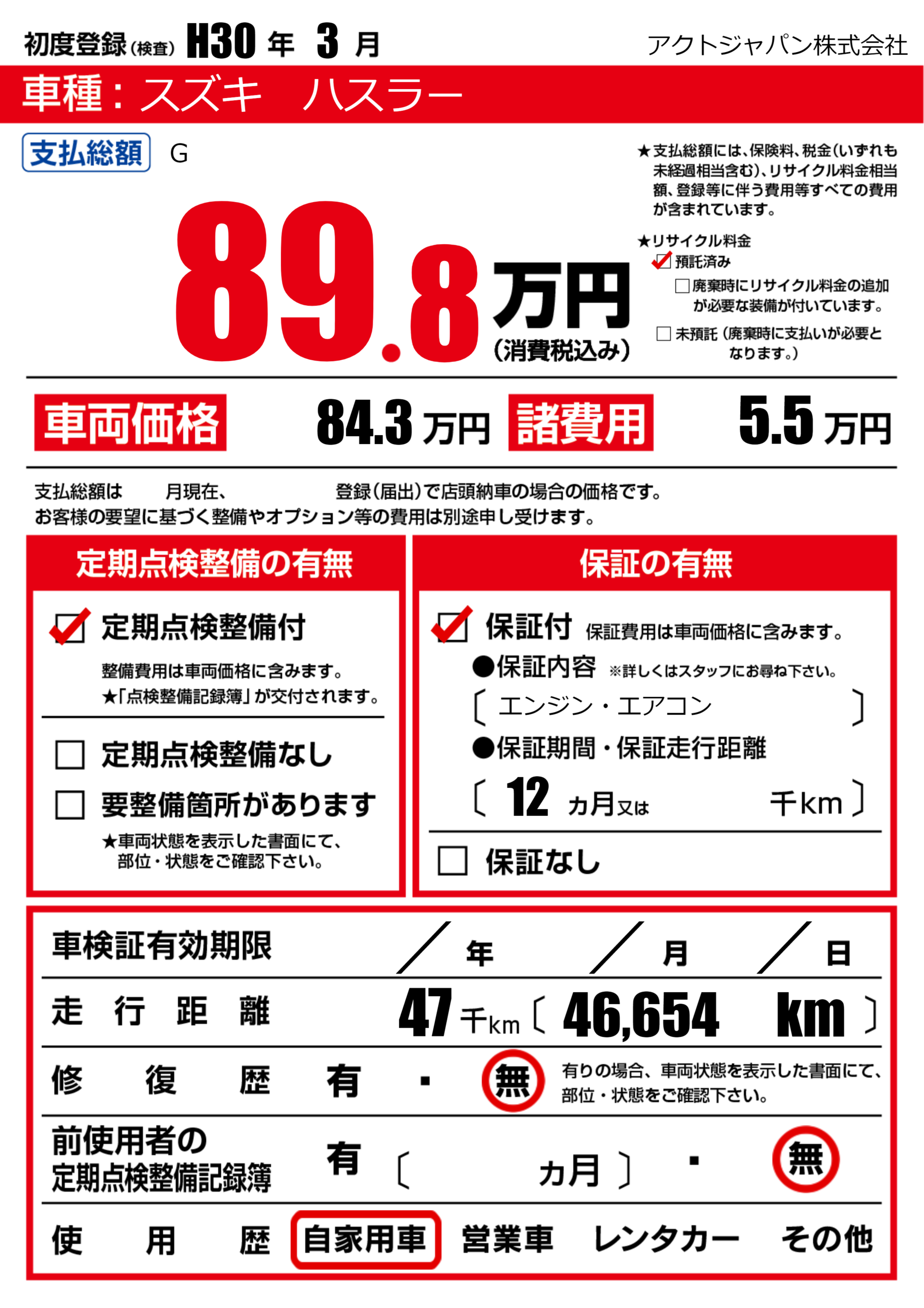 | 車名 | スズキ ハスラー | グレード ミッション 排気量 |