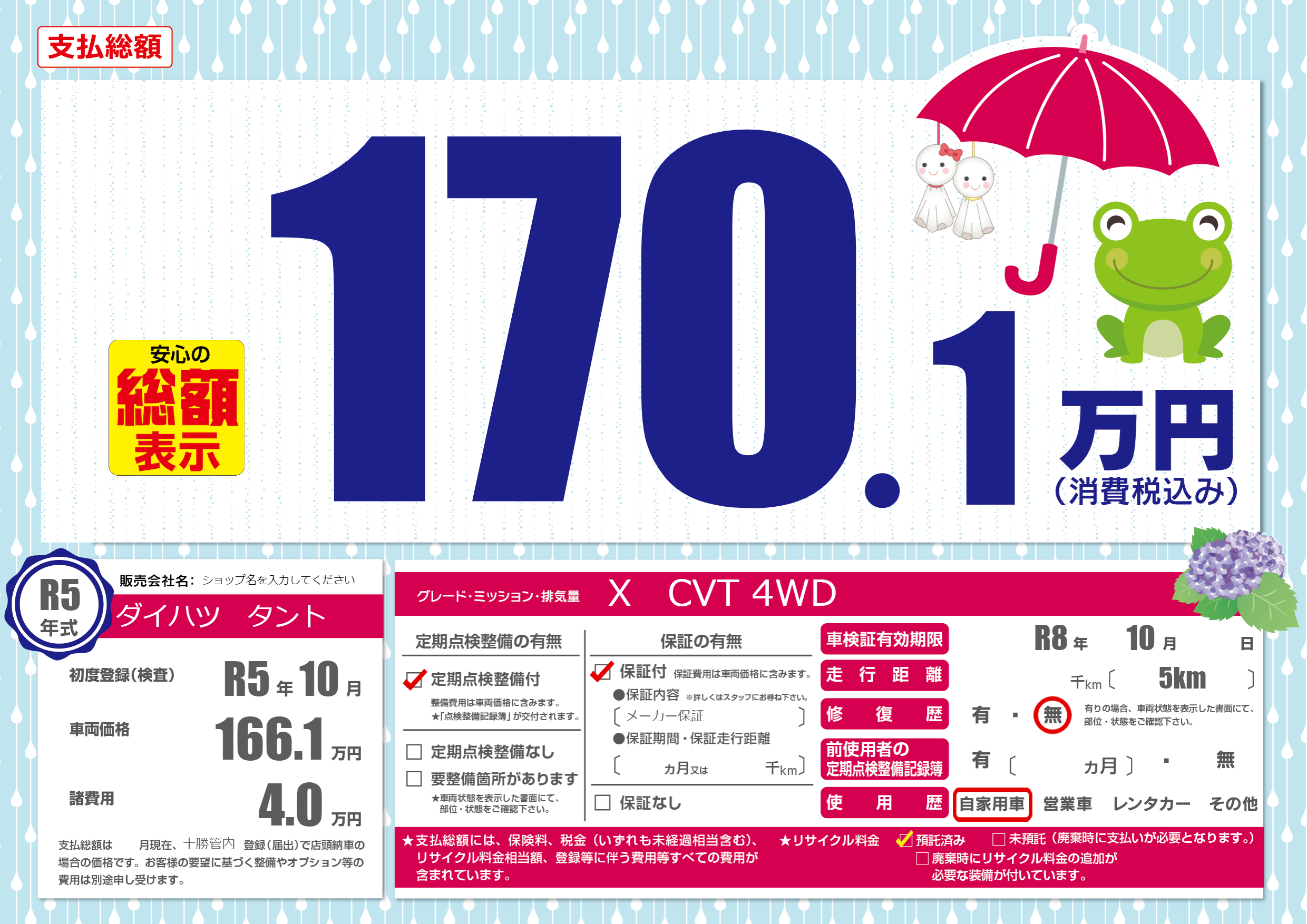 | 車名 | ダイハツ タント | グレード ミッション 排気量 |