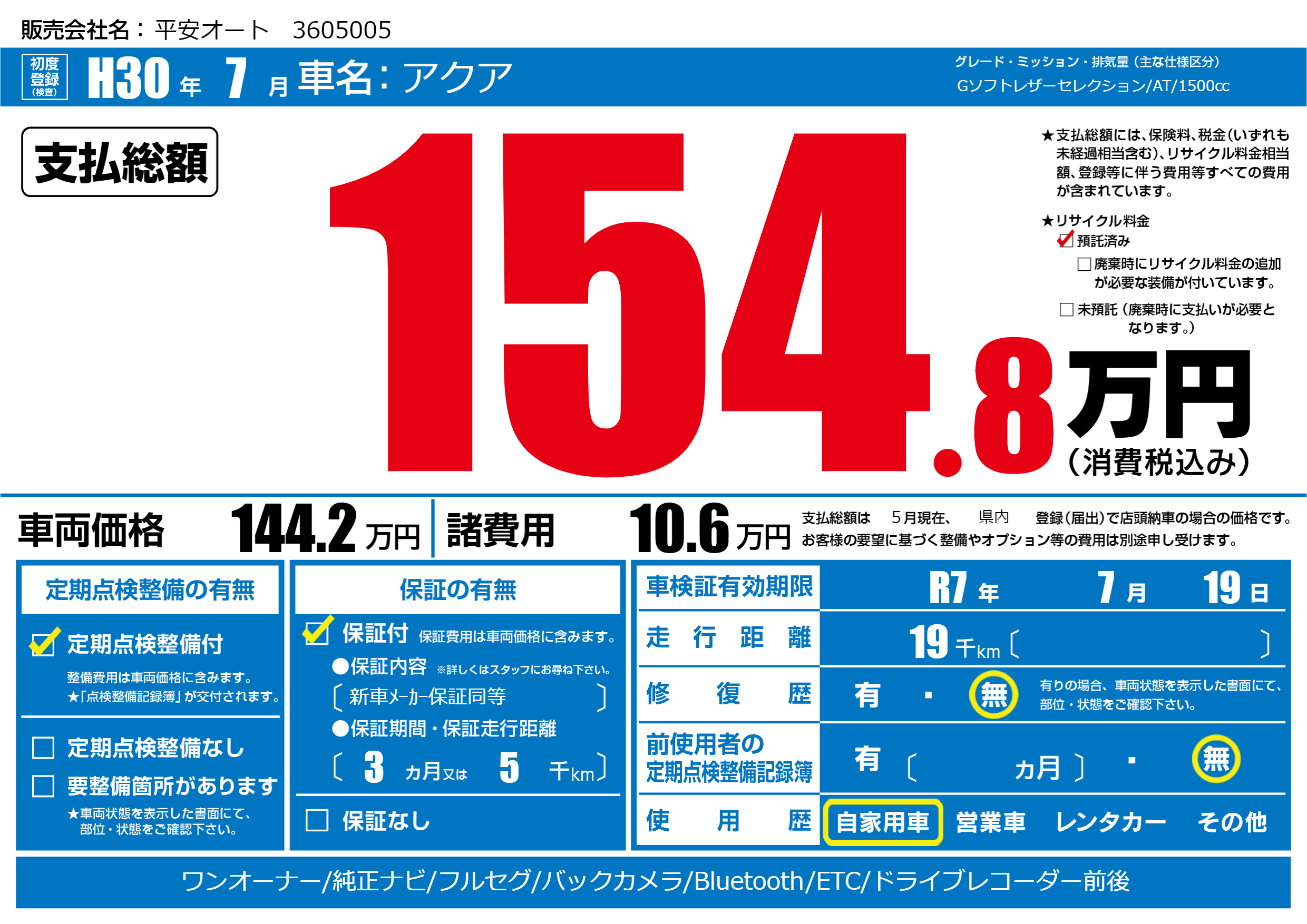 | 走行キロ | 1.9万km | 初年度登録 | H30年7月 |