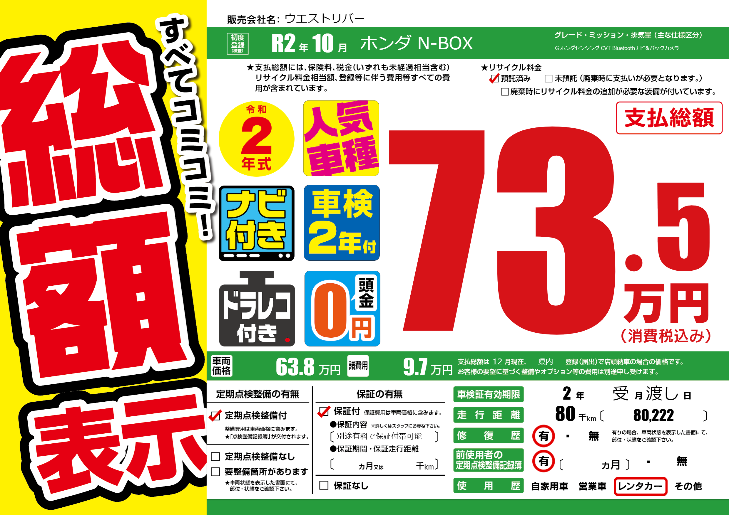 | 走行キロ | 8万km | 初年度登録 | R2年10月 |