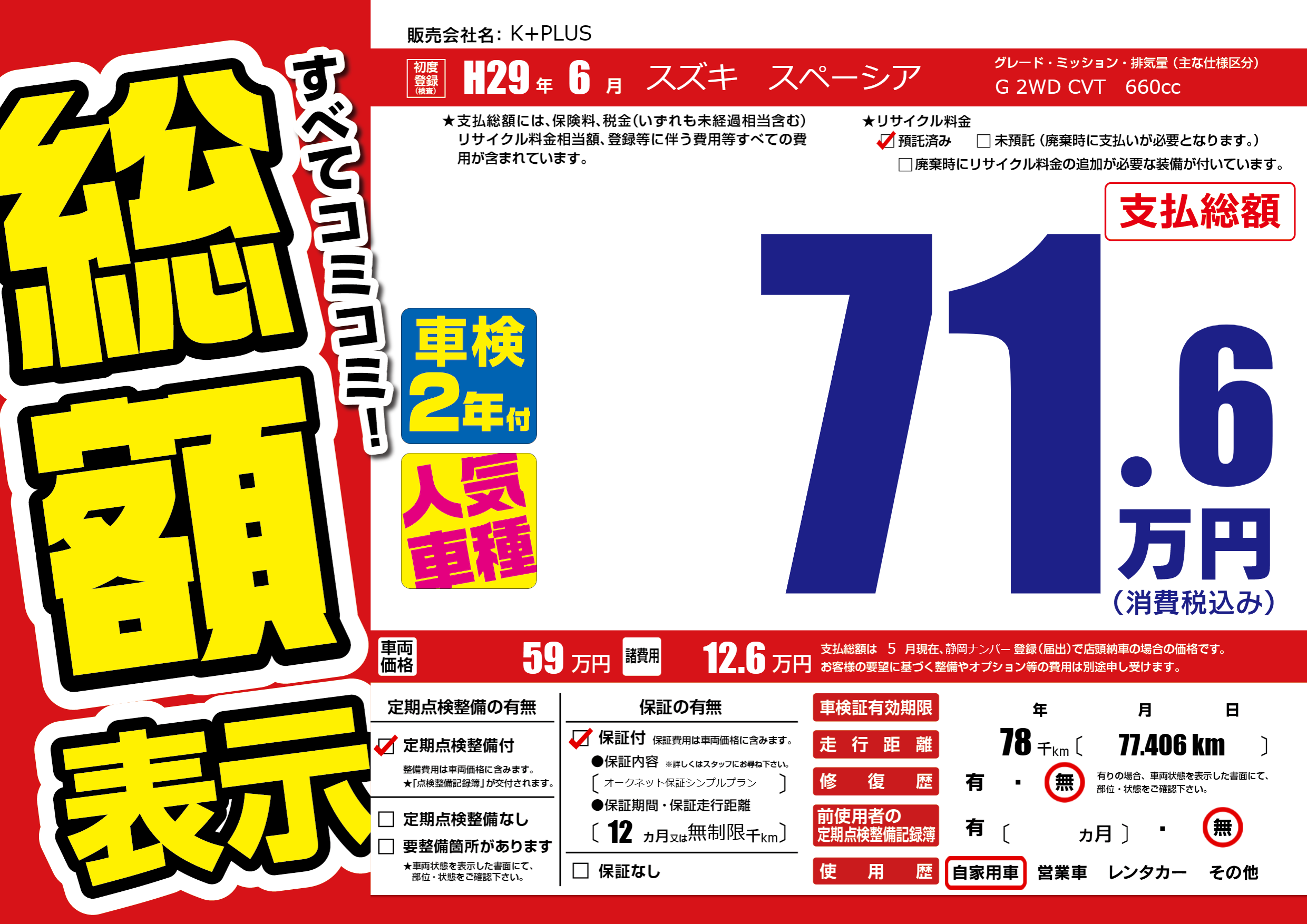 | 走行キロ | 7.8万km | 初年度登録 | H29年6月 |